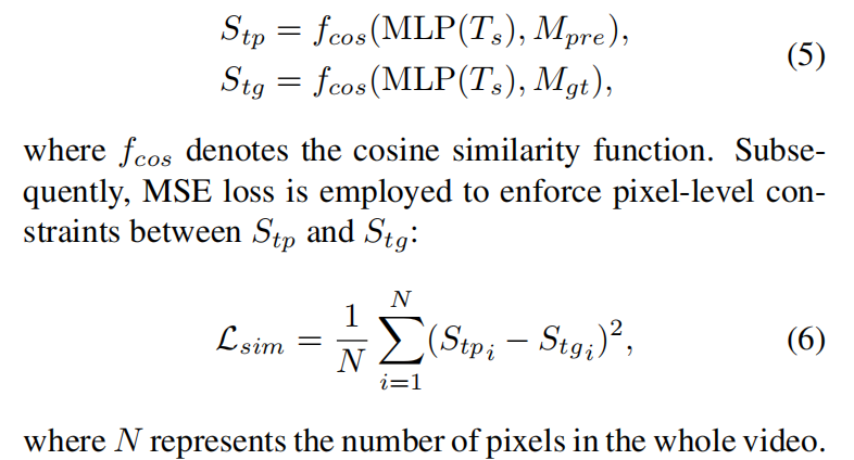 掩码-文本相似性损失(Mask-text Similarity Loss) :在 RVOS 任务中,评估分割掩码与真实掩码之间的相似性是至关重要的。然而,除了传统的基于掩码的评估标准外,还可以引入一种掩码-文本损失函数来评估分割结果。文本与掩码之间的相似性可以作为一种额外的评估指标。具体来说,我们使用句子嵌入 Ts 作为文本嵌入 T 的抽象表示,并通过 MLP 层将其在维度上压缩为一个标量,随后再扩展至与掩码相同的维度,并以此作为输出,用于计算文本与预测掩码 Mpre 之间的像素级相似性 Stp,以及文本与真实掩码 Mgt 之间的像素级相似性 Stg: