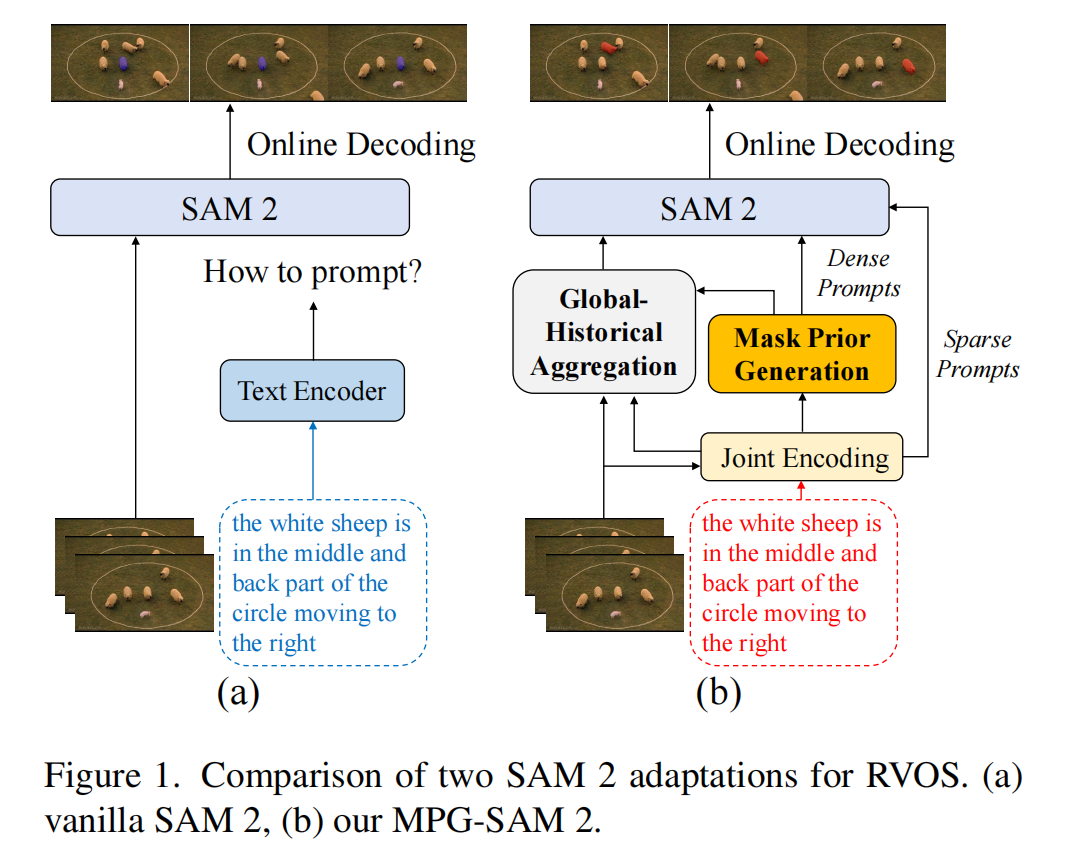 首先,SAM 2架构中固有的缺乏文本提示的问题阻碍了生成与提供的文本描述相匹配的精确提示,如图1(a)所示。尽管一些研究探索了这一领域,但仍需进一步改进。例如,RefSAM [22]将文本嵌入投影为稀疏和密集提示以供SAM使用,但独立编码的文本提示可能无法完全捕捉视觉语义,限制了SAM分割能力的有效利用。AL-Ref-SAM 2 [15]采用GPT-4和Grounding DINO [24]将文本信息转化为目标对象的框提示,但其多阶段流水线高度依赖上游模型的时空推理能力,且庞大的模型参数量限制了部署和推理效率。因此,如何有效对齐视觉-语言特征并提供精确提示以指导解码过程,是将SAM 2适配到RVOS的关键。