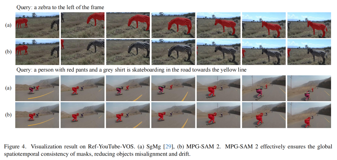 图4展示了我们的 MPG-SAM 2 模型与 SgMg [29] 在 Ref-YouTube-VOS 数据集上的可视化对比结果。结果清楚地表明,MPG-SAM 2 在预测精度和帧间一致性方面始终优于 SgMg。