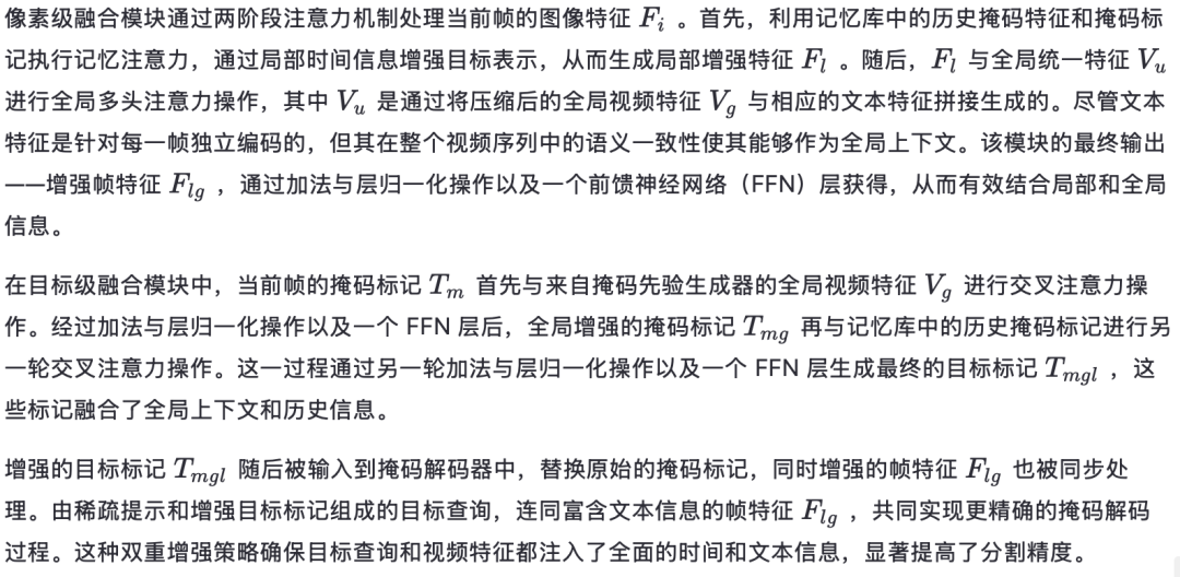 3.4. 分层全局-历史聚合器 与主要依赖过去信息的 VOS(视频目标分割)不同,RVOS(引用视频目标分割)强调对时间线索和文本线索的有效利用。受 [7] 的启发,我们提出了一种分层全局-历史聚合器,该聚合器将 SAM 2 的记忆机制与多级时间建模协同结合,从而在像素级和目标中心级实现全局上下文与历史分割结果的全面整合。如图 3 所示,分层全局-历史聚合器包含两个组件:像素级融合模块和目标级融合模块。