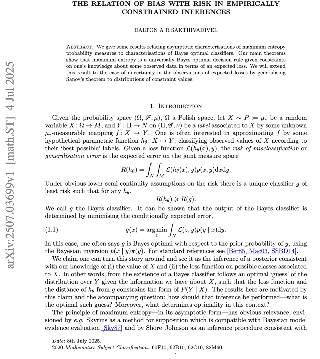 我们将在本文中讨论一组结果,这些结果将贝叶斯分类器的最优性与最大熵原理作为一种约束推断 形式的最优性联系起来。具体而言,我们的证明将使用大偏差理论 来将受约束的概率与最大后验估计 联系起来。我们框架的通用性远远超出了二次效用函数的范畴,例如回应了 Berger 对均方误差使用的批评。