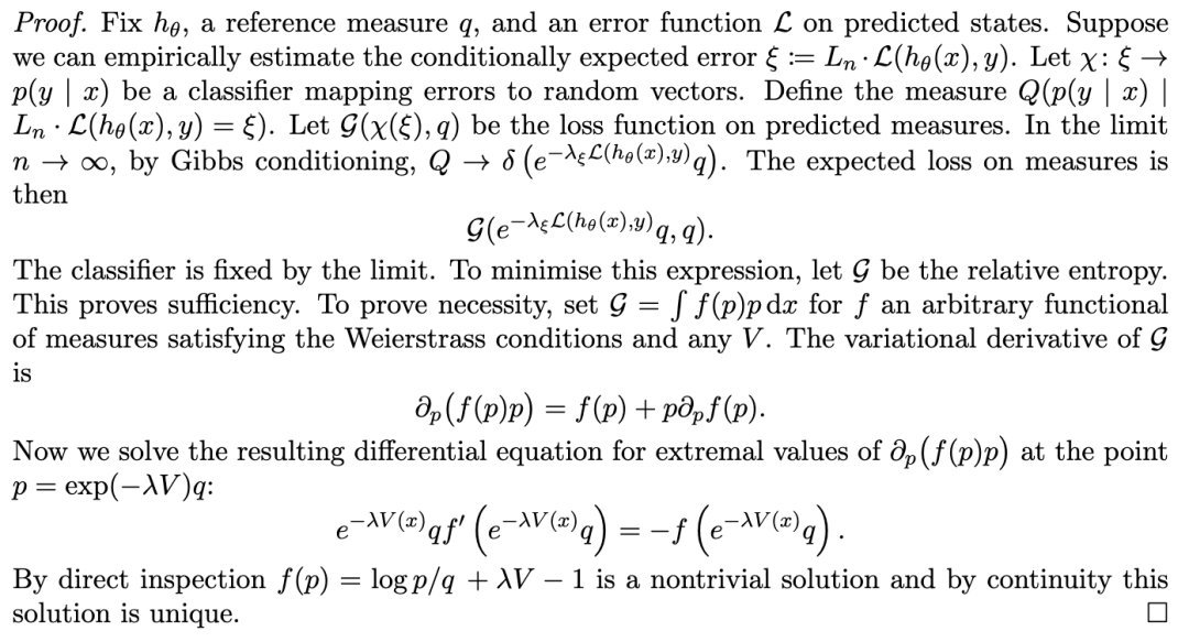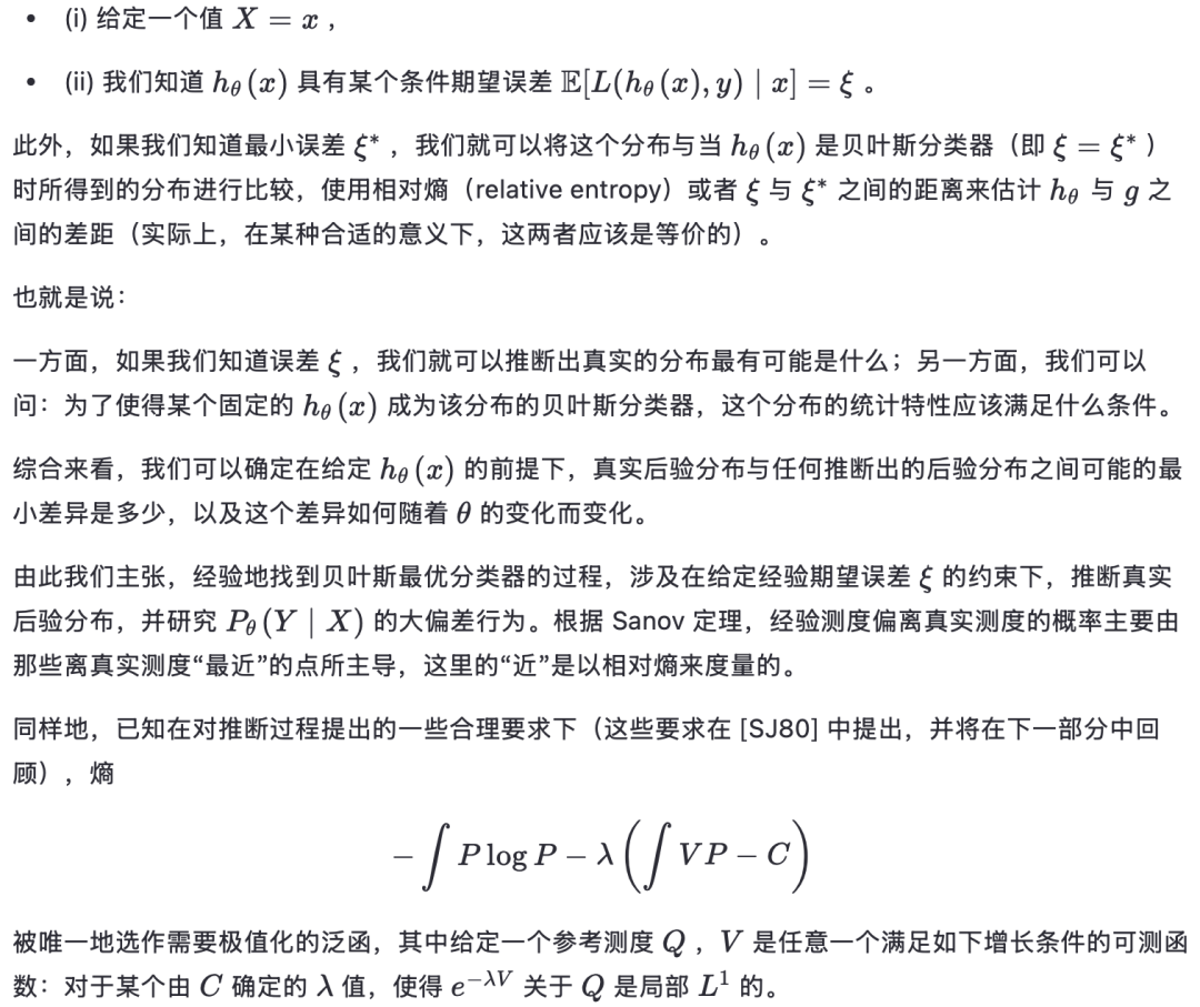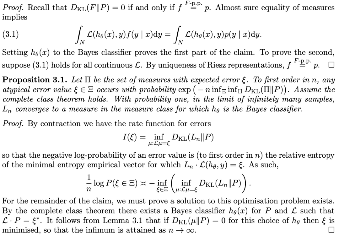 定理 3.1 。 如果预测测度上的误差函数是相对熵(relative entropy),那么在样本数量趋于无穷的极限下,将与给定误差相关的后验概率进行经验分类是贝叶斯最优的;反之亦然。