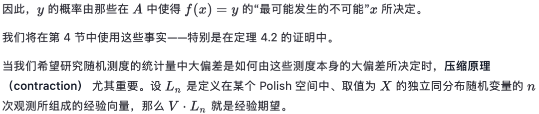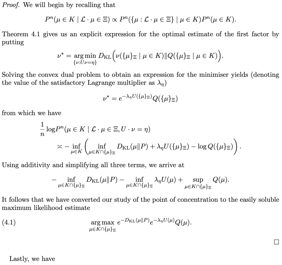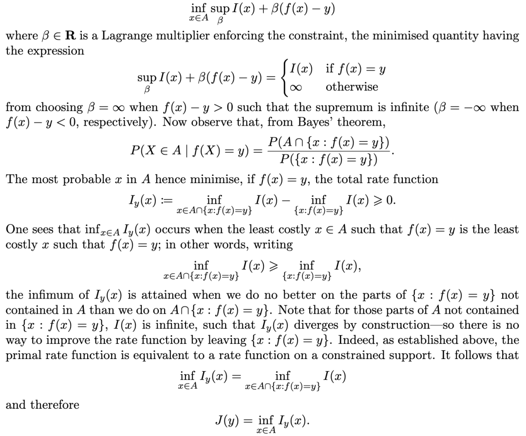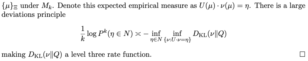 证明 。这是由定理 4.1 和命题 3.1 直接得出的结果——具体来说,是将关于经验测度的经验条件概率的三级大偏差原理压缩(contraction)为经验均值的一级大偏差原理。特别地,最可能的 μ极小化了总的速率函数:
