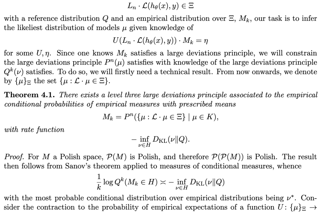 这个定理的含义是:在我们对期望值 L⋅μ在 Ξ中的分布存在不确定性的情况下,所涉及的条件测度必须被估计为关于 μ统计特性的一种模型。这属于三级大偏差原理 (level three large deviations principle),其含义是,它描述了测量 L⋅μ的经验过程,并估计误差的最可能分布。