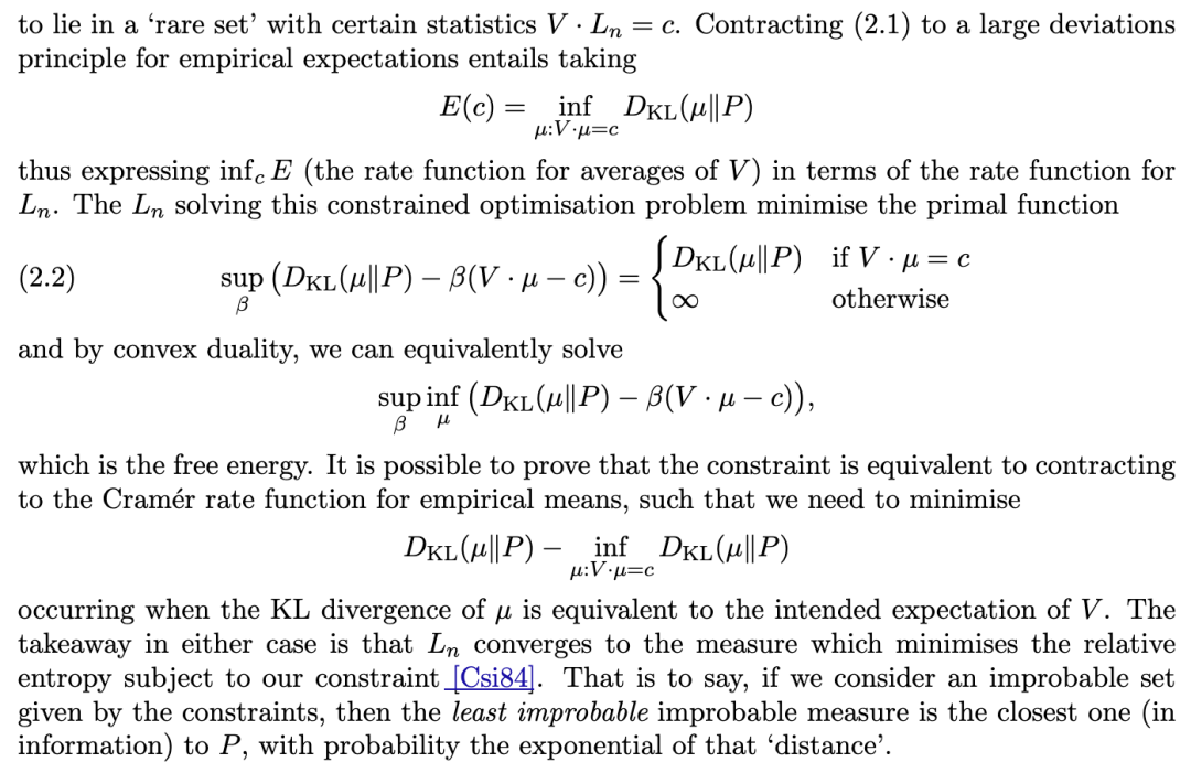 从这个角度来看,统计力学的核心理念是:在测量到某个宏观态的平均值时,推断出最可能的微观态 。事实上,这类大偏差原理在 [DZ96] 中被称为“吉布斯条件化原理 (Gibbs conditioning principles)”。