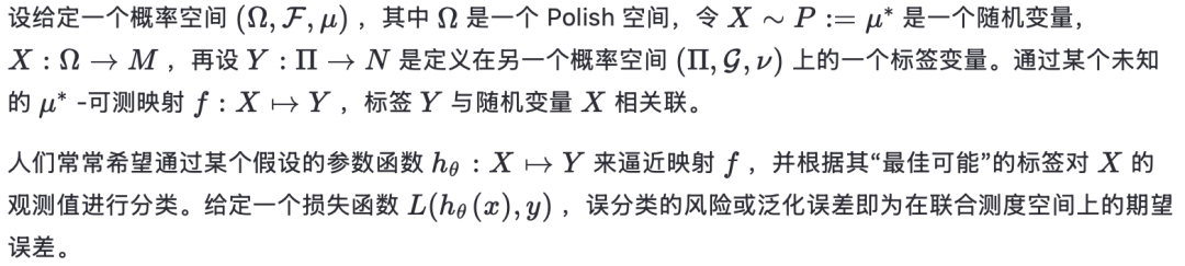 我们将在适当的地方隐式地假设绝对连续性 ,例如在讨论相对熵时。我们还将假设真实测度 和真实标签是已知的,例如,这是为了训练或对真实测度进行参数分布拟合的目的。