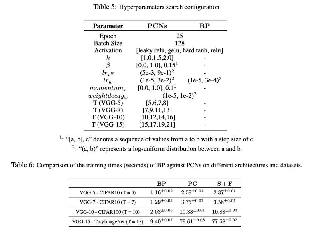 我们基于表5中指定的搜索空间进行超参数选择。所有实验均使用基于JAX的PCX库Pinchetti等人[2024]实现,该框架专为预测编码网络设计,并提供了全面的基准测试能力。所有实验均在NVIDIA A100/H100 GPU上进行,每次试验都使用Tree-Structured Parzen Estimator(TPE)算法Watanabe [2023]进行500次迭代的超参数搜索。表1和图4中展示的结果是使用5个不同的随机种子(从0到4中选取)并采用最优超参数配置所得。训练过程最多进行50个训练轮次(epochs),并设置了早停机制:如果连续10个epoch没有准确率的提升,则提前终止训练。为了与超参数搜索设置保持一致,我们采用了一个两阶段的学习率调度策略:在前25个epoch中,权重学习率遵循之前描述的预热-余弦退火调度;之后,学习率保持在调度器的最终学习率不变。对于图2和图5中展示的结果,我们使用单个随机种子和最优超参数配置,将最大训练轮次数设置为50,并未启用早停机制。权重学习率调度方式与前述方法保持一致。