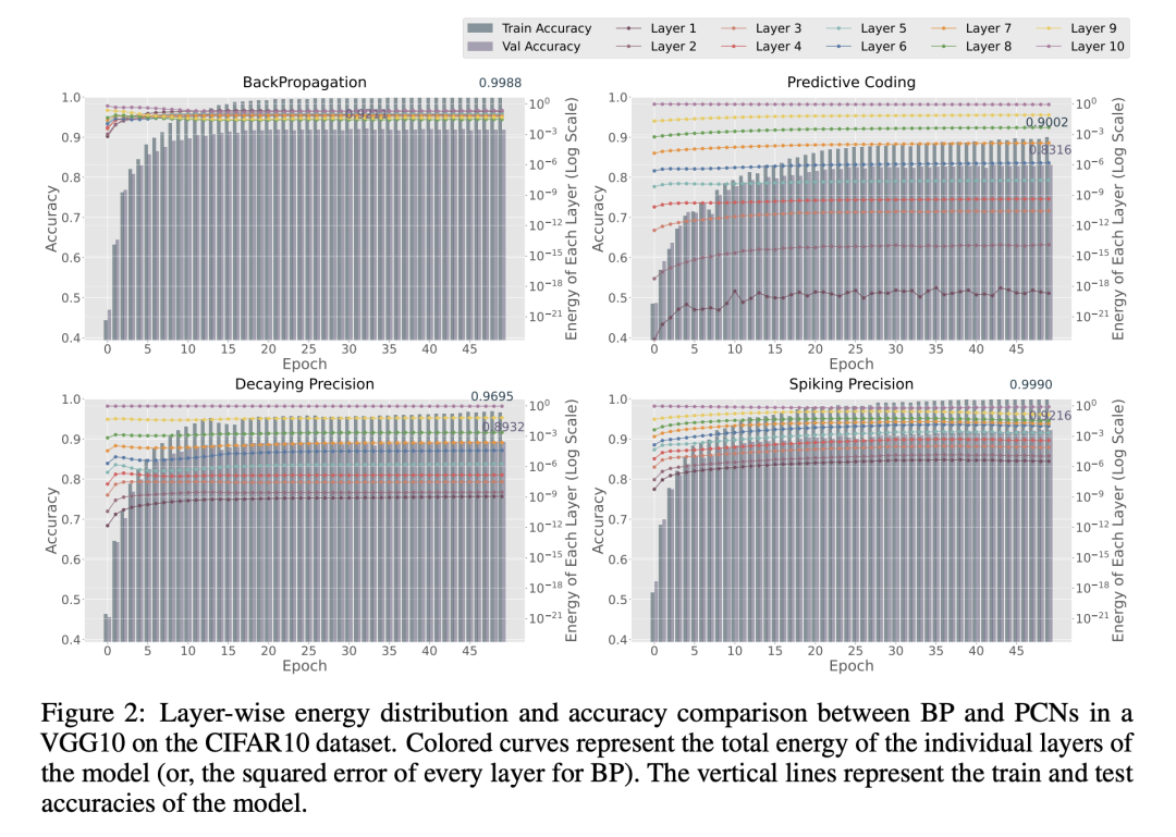 由于BP并没有明确的能量定义,因此我们使用了反向传播过程中每一层计算出的平方误差,这在权重参数更新方面等同于PC方法中的误差。可以观察到,在PCN中存在显著的能量不平衡现象,其中早期层的能量比后期层低多个数量级。这在BP训练的模型中并未出现,BP模型表现出更均匀的能量分布,甚至能量最低的层也高于10⁻²。