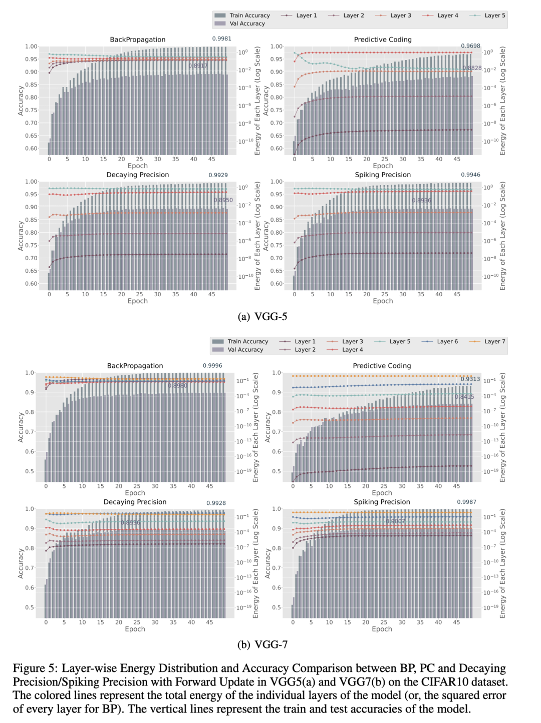 在本节中,我们特意从实验框架中选取了VGG5和VGG7架构,用于进行模型间能量分布的对比可视化。图5和图2展示了在CIFAR10数据集上,反向传播(BP)、预测编码(PC)、我们提出的“衰减精度+前向更新”(D + F)以及我们提出的“脉冲精度+前向更新”(S + F)这四种方法在VGG5(图5(a))、VGG7(图5(b))和VGG10(图2)架构下的各层能量分布和分类准确率。