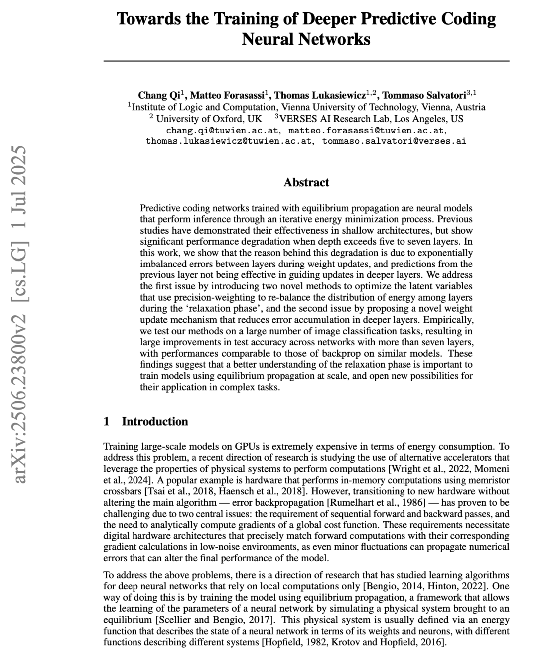 在GPU上训练大规模模型在能耗方面极为昂贵。为解决这一问题,近期的研究方向之一是研究利用物理系统特性进行计算的替代加速器 [Wright et al., 2022, Momeni et al., 2024]。一个典型的例子是利用忆阻器交叉阵列进行存内计算的硬件 [Tsai et al., 2018, Haensch et al., 2018]。然而,在不改变主要算法——误差反向传播 [Rumelhart et al., 1986] 的情况下,转向新型硬件已被证明具有挑战性,原因在于两个核心问题:需要顺序执行前向和反向传播过程,以及需要解析地计算全局代价函数的梯度。这些要求需要数字硬件架构精确匹配前向计算及其对应的梯度计算,且必须在低噪声环境中进行,因为即使是微小的波动也可能传播数值误差,从而改变模型的最终性能。 为解决上述问题,一个研究方向是研究仅依赖局部计算的深度神经网络学习算法 [Bengio, 2014, Hinton, 2022]。其中一种方法是通过平衡传播来训练模型,这是一种框架,允许通过模拟达到平衡状态的物理系统来学习神经网络的参数 [Scellier and Bengio, 2017]。这种物理系统通常通过能量函数定义,该函数用神经网络的权重和神经元描述其状态,不同的函数描述不同的系统 [Hopfield, 1982, Krotov and Hopfield, 2016]。