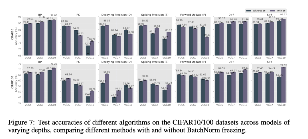 第三,我们发现,将BatchNorm冻结(BF)与我们的精度模块和前向更新机制结合使用时,能够显著提升模型性能。如图7所示,将BF与我们提出的方法(D + F 和 S + F)结合后,在所有网络深度以及CIFAR10和CIFAR100数据集上都一致提升了准确率。具体而言,在VGG10架构下,S + F 配置结合BF在CIFAR10上达到了93.27%的准确率,在CIFAR100上达到了72.02%,甚至超过了BP基线。相比之下,当将BF应用于标准PC或仅与前向更新结合时,大多数情况下我们观察到的是性能下降而非提升。对于仅使用衰减精度或脉冲精度但没有前向更新的模型,BF在不同网络深度下的效果不一致且难以预测。这些结果表明,我们所提出组件之间的协同作用至关重要——BF似乎只有在与我们的能量平衡机制(无论是衰减精度还是脉冲精度)以及前向更新机制共同使用时,才能稳定训练动态。这种协同作用使得深层网络在整个训练过程中保持稳定的梯度,从而实现更稳健的优化,最终获得更高的分类准确率。