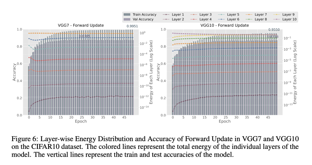 其次,我们观察到,在大多数情况下,移除衰减/脉冲精度模块会导致性能下降。这一效应在VGG7/10等深层模型中尤为明显,没有精度项时,各层之间的能量分布变得显著不平衡。如图6和图5所示,在VGG7架构中使用脉冲精度和前向更新的情况下,第一层的能量占比约为10⁻⁶,而在没有脉冲精度的模型中,该比例骤降至10⁻¹²。对使用衰减/脉冲精度+前向更新与仅使用前向更新之间的逐层能量分布可视化表明,我们提出的方法成功地平衡了各层之间的能量分布,从而提升了模型性能。