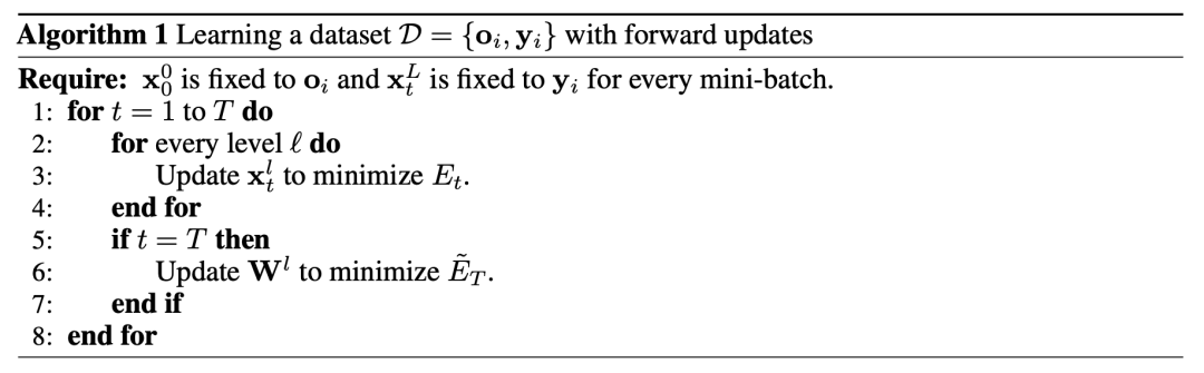 我们的方法确保了权重的调整仍然与初始的前馈预测保持联系,同时又融合了通过迭代推断获得的更精细的表示。这种方法的优势在于能够在学习过程中保持稳定性,并防止误差在深层中累积,这对于扩展预测编码(PC)网络至关重要。但其缺点是需要在内存中存储额外的信息,这些信息仅用于权重更新,因此相比原始方法,生物合理性略差一些。此前有研究以不同的方式使用过类似形式的能量函数,但那些工作中该函数是用来指导神经活动的更新而非权重更新 [Whittington 和 Bogacz, 2017]。伪代码详见算法 1。