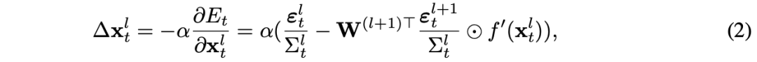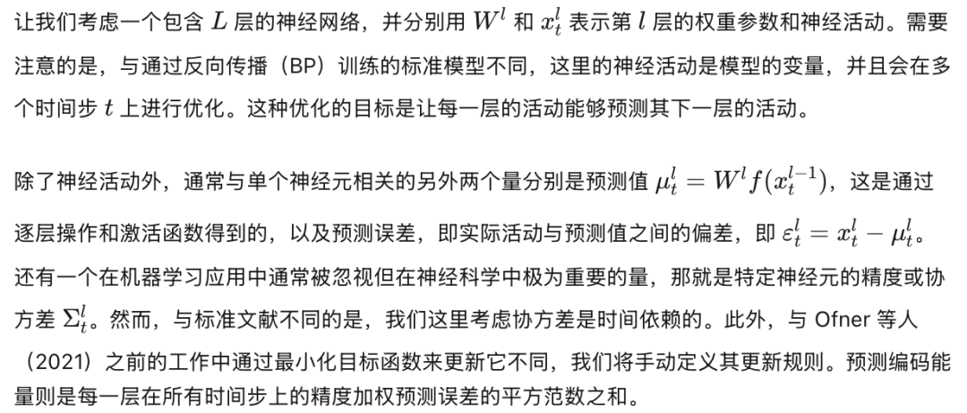 我们假设协方差是与网络层相关的:同一层中的所有神经元具有相同的协方差。为此,当协方差 Σₗₜ 是一个标量值,或是一个其对角线元素均等于该标量的对角矩阵时,我们使用相同的记号。关于预测编码网络的详细结构,我们参考图1(a)。