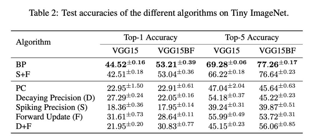 扩展规模。为了看看我们的方法在更大规模的数据集和更深的网络上能扩展到什么程度,我们还在Tiny ImageNet [Le和Yang,2015]上测试了VGG15,Tiny ImageNet是ImageNet的一个缩小版,包含200个类别。我们使用的模型与混合平衡传播工作中提出的模型完全相同 [Nest和Ernoult,2024]。表2中报告的结果更加强有力地显示了我们的方法相对于PC原始公式的效果。具体来说,我们观察到大多数单独的推理方法,即使是使用精度加权的方法,在这项具有挑战性的任务上也无法达到BP的性能。然而,当我们使用本工作中提出的所有新方法组合时,结果得到了匹配:前向更新、尖峰精度和批量归一化冻结。