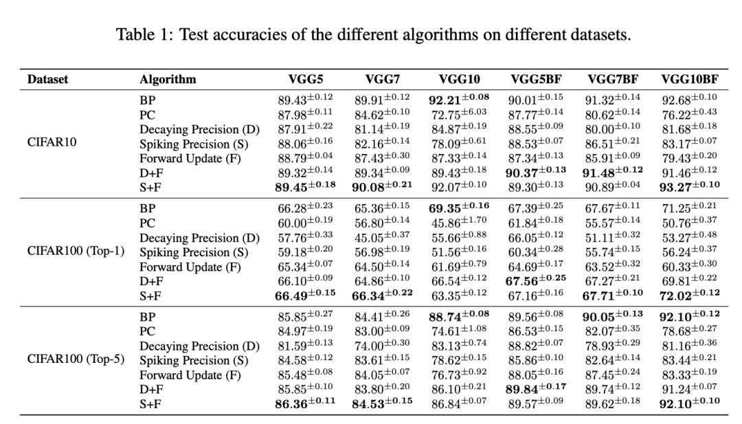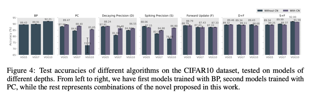 性能退化。在第一个实验中,我们在不同深度的VGG模型上测试了一些提出的算法,并在图4中报告了它们的测试准确率随层数变化的条形图。这些图表表明,当模型深度增加时,PC的原始公式以及使用中心调整的公式在测试准确率上都显著下降。相比之下,我们提出的方法组合(精度和前向更新,即D+F和S+F)表现出色,尤其是在模型深度增加时,显著避免了准确率的大幅下降。特别是,带有前向更新的尖峰精度是唯一一种在VGG5/7/10模型中表现出与BP相当性能的方法组合。我们稍后会看到,这一结果与更复杂的实验结果一致,即该方法仍然是总体上表现最佳的方法。在没有前向更新的模型中,与先前的研究结果一致,使用中心调整可以提高算法的准确率,尤其是在大多数情况下,随着模型层数的增加,这种效果更加明显。然而,我们发现一旦添加了前向更新,中心调整就不再带来性能上的好处。因此,从现在开始,我们将只报告使用PC标准公式(没有任何调整)的实验。