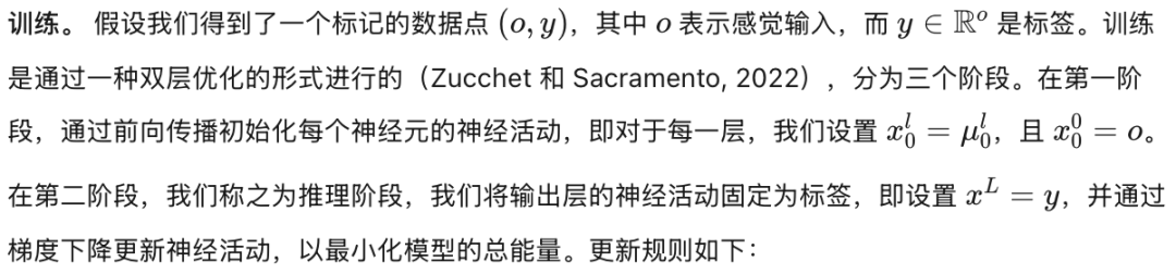 预测编码(PC)。 我们这里使用的预测编码最初是为了模拟大脑中的层次化信息处理而开发的 [Rao and Ballard, 1999, Friston, 2005]。直观地说,这一理论认为,层次结构中某一层次的神经元和突触会更新,以更好地预测下层神经元的活动,从而最小化预测误差。有趣的是,同样的算法也可以用作深度神经网络的训练算法 [Whittington and Bogacz, 2017],并且观察到其与反向传播有许多相似之处 [Song et al., 2020, Salvatori et al., 2022a]。为此,它已在众多机器学习任务中得到应用,包括图像生成和分类、自然语言处理以及联想记忆等 [Sennesh et al., 2024, Salvatori et al., 2023, Pinchetti et al., 2022, Ororbia and Kifer, 2020, Salvatori et al., 2021]。同样,目前的最新研究进展是通过训练具有 5 层隐藏层的卷积模型实现的,一旦使用 7 层深的模型,性能就开始变差 [Pinchetti et al., 2024]。PC 与 EP 之间的联系可以通过双层优化的概念很好地加以解释 [Zucchet and Sacramento, 2022],其中用于学习的神经活动是物理系统的平衡态。关于描述在这种设置中进行学习的更一般框架(但与所使用的物理系统和能量函数无关),我们参考了两篇最近的研究 [Ernoult et al., Scellier et al., 2022]。