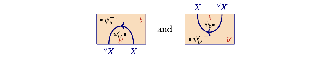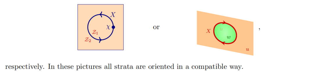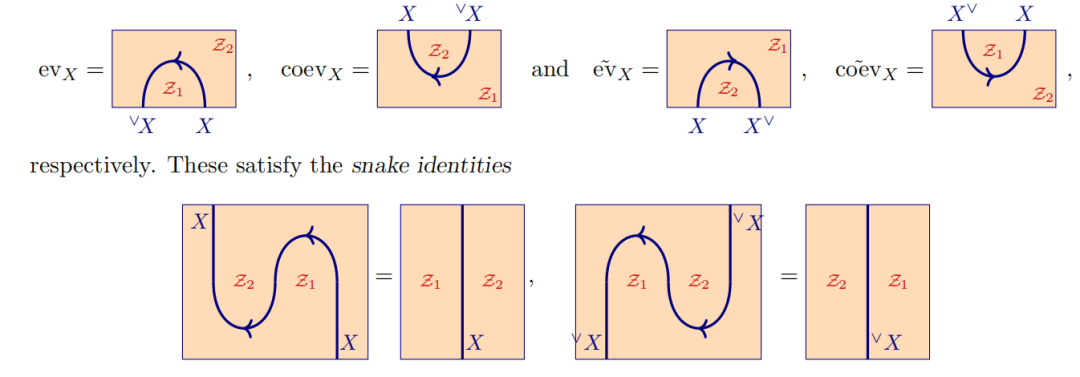 让我们更详细地解释二维情形下的结构:每个 1-态射 X : Z₁ → Z₂(即两个量子场论之间的 1 维拓扑缺陷)都有左右伴随,即存在 1-态射 ∨X : Z₂ → Z₁ 与 X∨ : Z₂ → Z₁,二者均通过反转 X 的定向得到;并配备 2-态射: