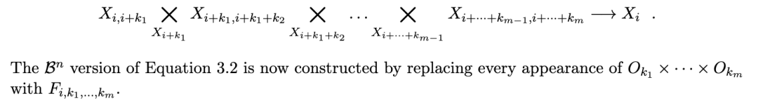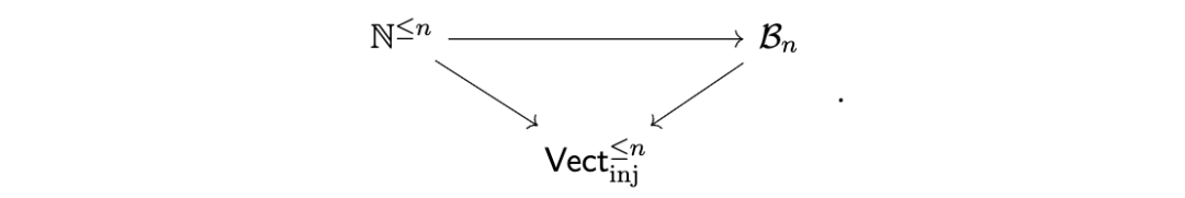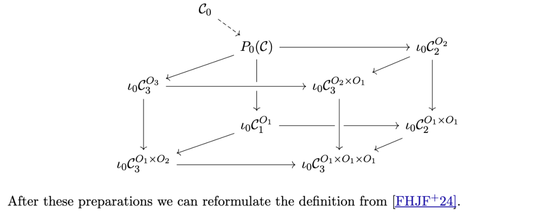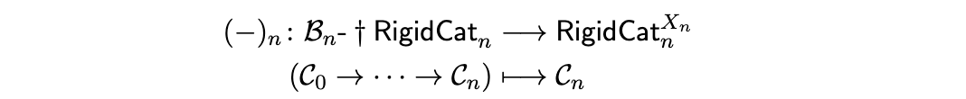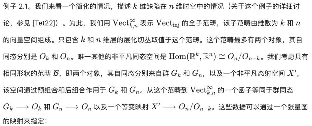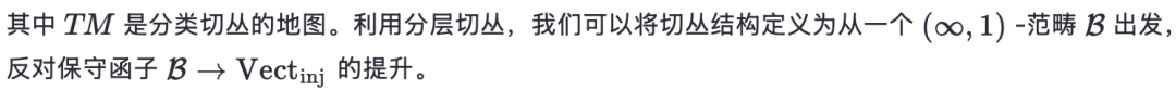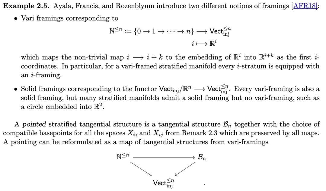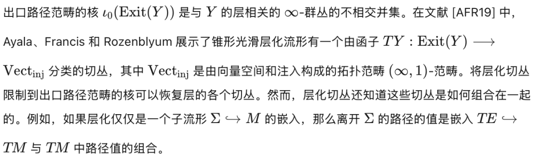 对于任意分层拓扑空间 Y,我们可以关联其 (∞, 1) 出路经范畴(exit path category)[Lur17, 附录 A.5],其对象是 Y 中的点,其态射是允许从较低维胞腔进入较高维胞腔的路径,但不允许再返回。例如,Rⁿ 中一个余维为 1 的平面的出路经范畴,等价于“行走的跨度”(walking span):