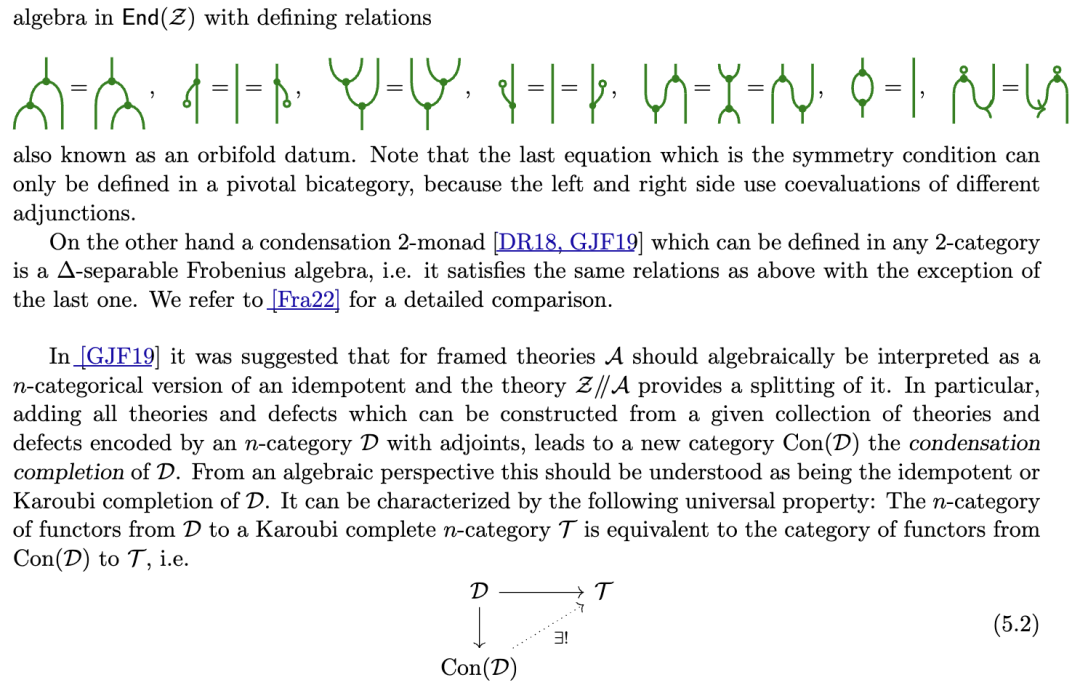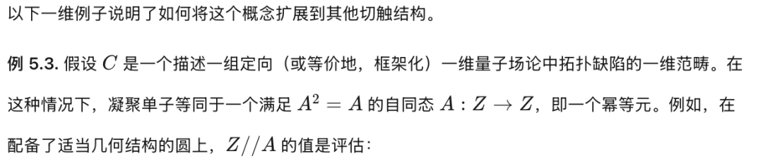 人们普遍相信(并在低维情形已证明),量子场论中的拓扑缺陷可组装成高阶范畴 D,它编码了这些缺陷的许多物理性质;参见 [CDZR23] 的近期综述。D 的对象是量子场论;1-态射表示这些理论之间的余维 1 拓扑缺陷,其复合由“融合”给出——即把缺陷靠近的操作。类似地,2-态射对应余维 2 拓扑缺陷,依此类推,更高阶的态射表示更高余维的缺陷。实践中,确定所有拓扑缺陷的完整范畴往往过于困难,人们通常只能获得 D 的某些更简单的子范畴。这些拓扑缺陷范畴通常是线性的。在本文中我们将基本忽略这一点,因其已在 [Kap10, JF22] 等文献中详细讨论,而关注其结构中一个较少被探索的方面。