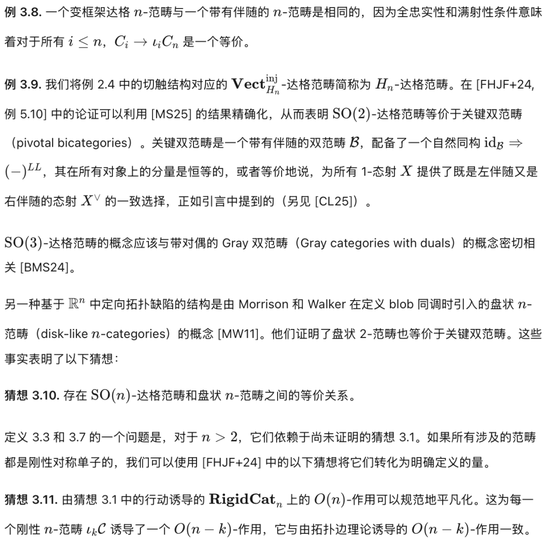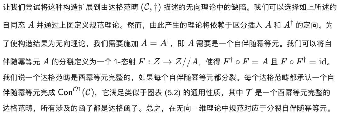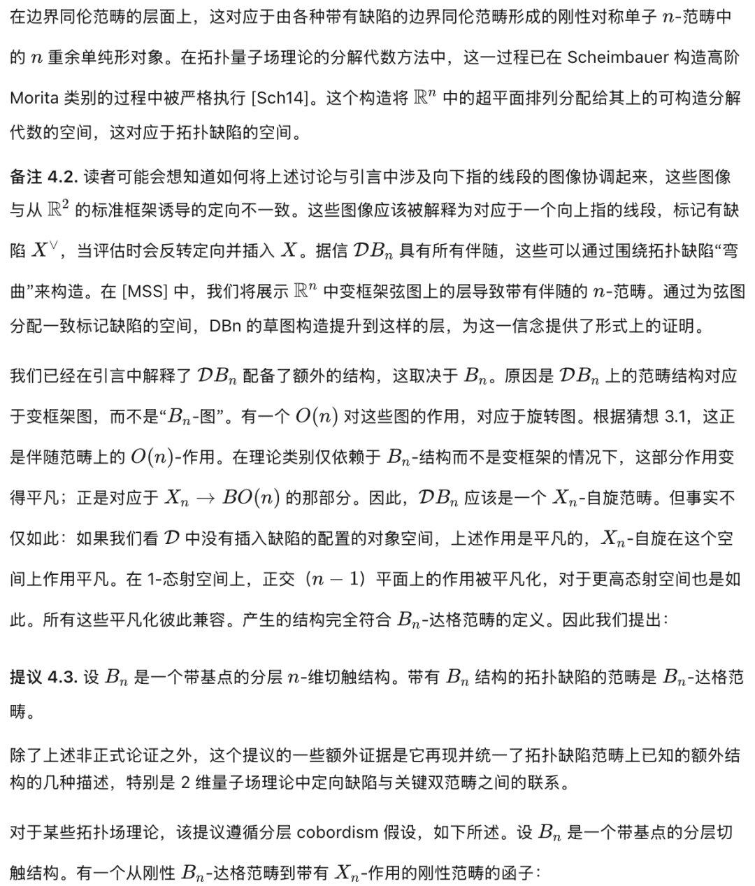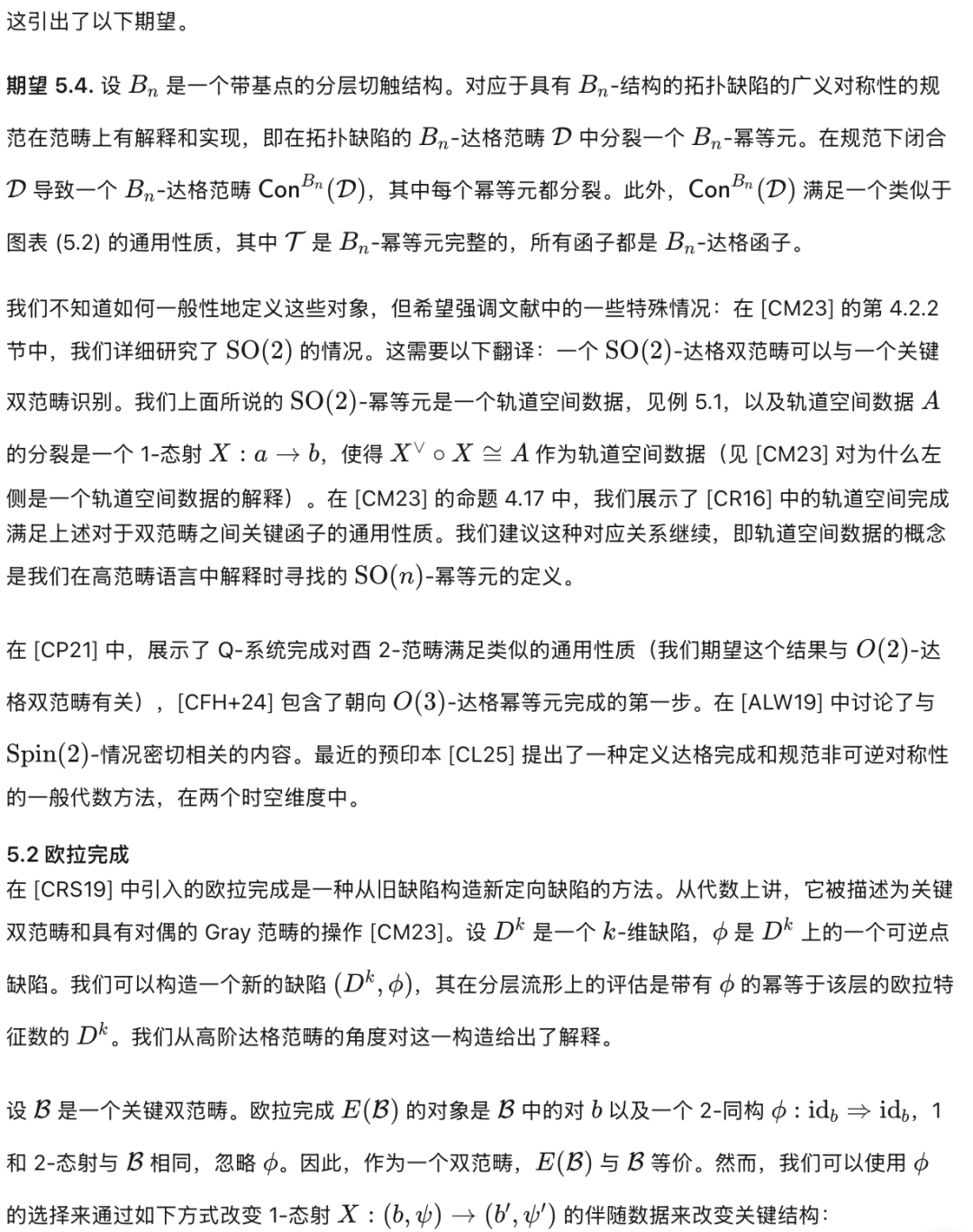 上述两个例子中,拓扑缺陷范畴所携带的额外结构都有一个共同特征:它们都包含从范畴论角度看“不自然”的条件——要求对象或 1-态射相等而非同构:(-)† 在对象上是恒等,且左右伴随相等。我们认为,这并非缺陷,而是该构造的本质特征,任何描述缺陷的一般数学框架都应具备这一点。