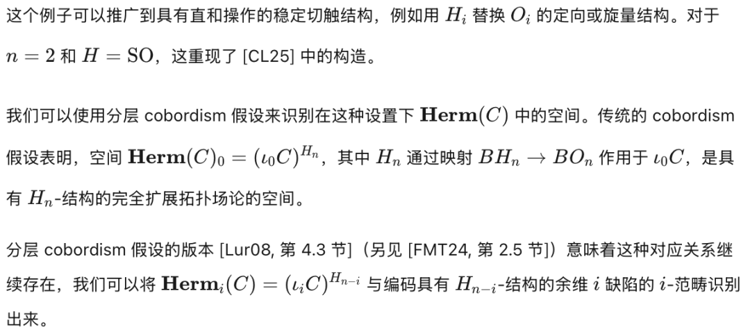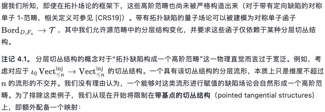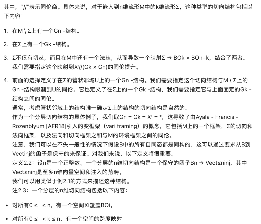 依赖于切向结构(见 [DYY25] 对整体结构的讨论),如定向或旋量结构的高阶拓扑缺陷范畴,仍是一个重要的开放问题。本文提出一个系统的数学框架来解决这一问题。不同余维的缺陷可能各自携带不同的切向结构,它们之间的相互作用也可能高度非平凡。我们采用 Ayala、Francis 与 Rozenblyum [AFR18, AFR19] 的方法,利用锥光滑分层空间的切丛来定义缺陷上的切向结构。