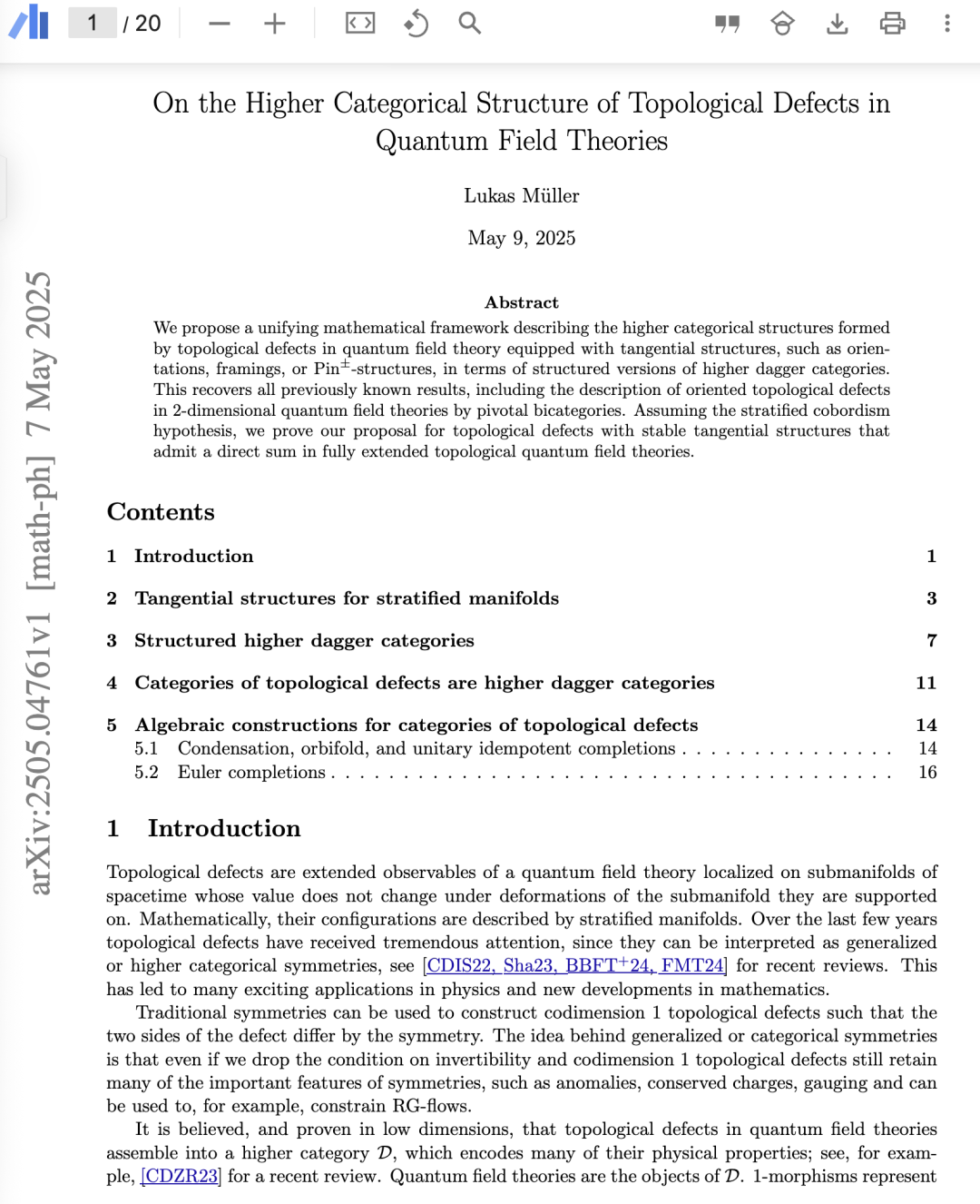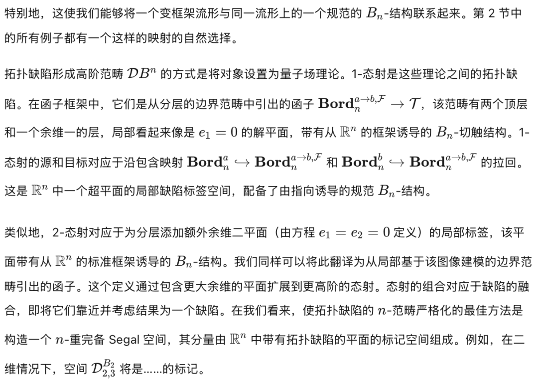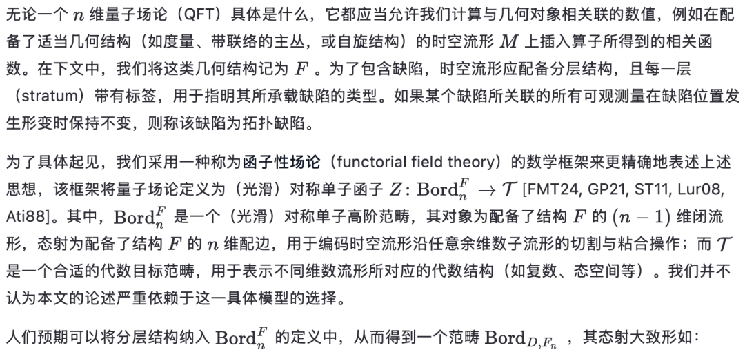1 引言 拓扑缺陷是量子场论中局域在时空子流形上的扩展可观测量,其值在这些子流形发生形变时保持不变。从数学上讲,它们的构型由分层流形描述。近年来,拓扑缺陷受到极大关注,因为它们可被解释为广义或高阶范畴对称性,详见近期综述 [CDIS22, Sha23, BBFT+24, FMT24]。这已在物理和数学中引发众多激动人心的应用与新进展。