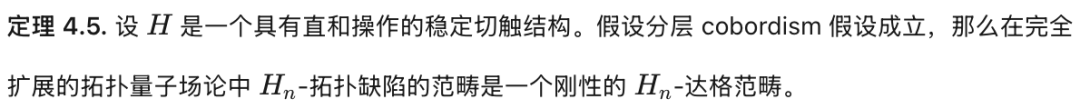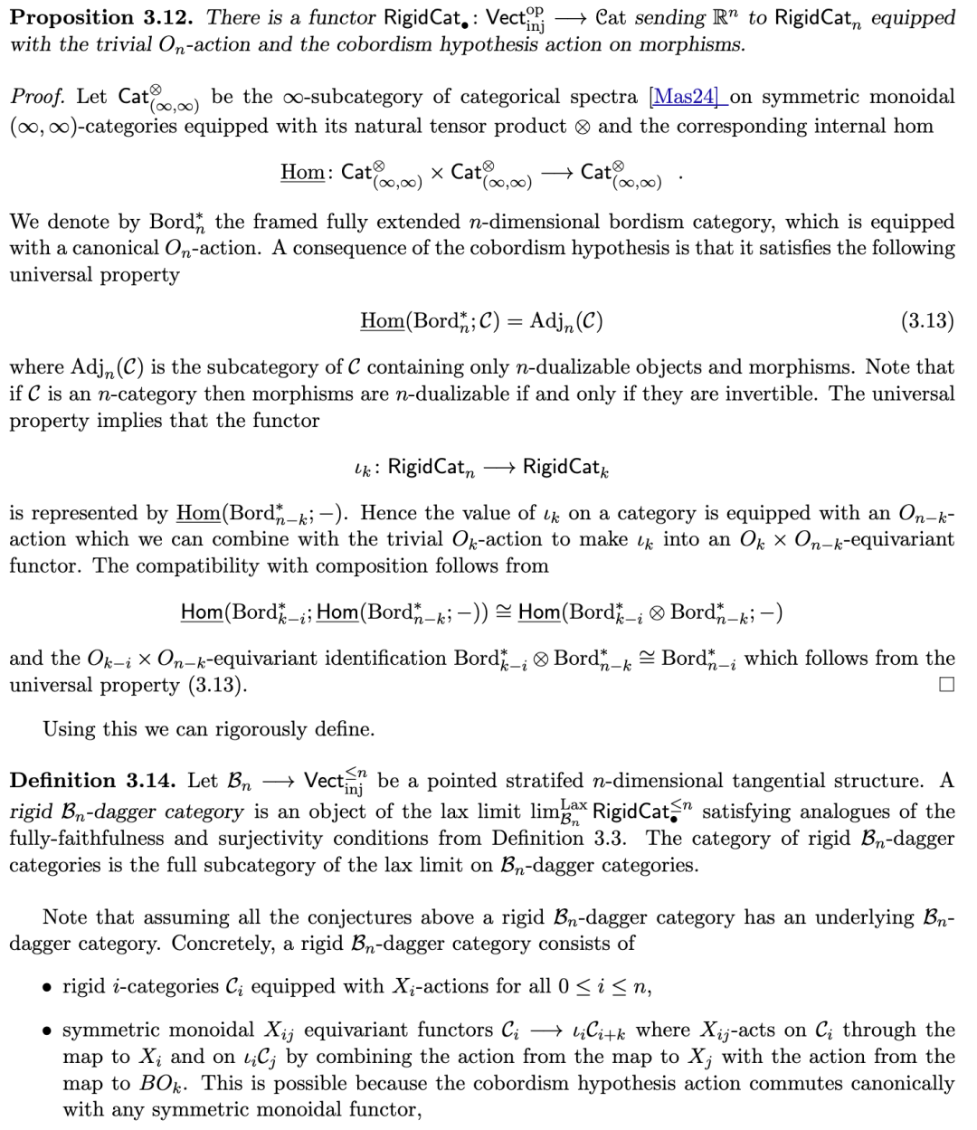 摘要 我们提出了一个统一的数学框架,用带切向结构(如定向、标架或 Pin± 结构)的拓扑缺陷量子场论,来描述由这些缺陷形成的高阶范畴结构;该框架以带结构的高阶 † 范畴(higher dagger categories)的语言表述。该框架恢复了所有已知结果,包括用 pivotal 双范畴描述二维量子场论中的定向拓扑缺陷。在假设分层配边假说的前提下,我们为在完全扩张拓扑量子场论中具有稳定切向结构且允许直和的拓扑缺陷证明了该框架的正确性。