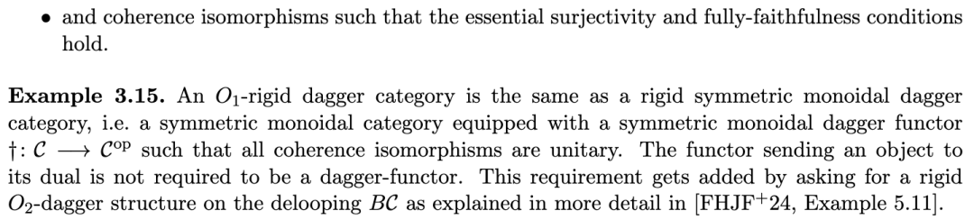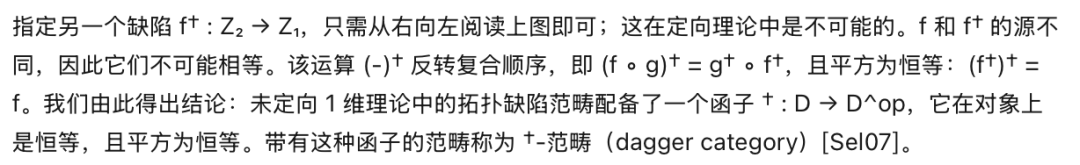 通常,这种额外的 †-结构是区分定向与未定向缺陷范畴的唯一方式。例如,对于以 Vect 为靶的拓扑场论,定向缺陷范畴等同于有限维向量空间与线性映射的范畴;而未定向缺陷范畴则对应于配备了非退化对称双线性形式的向量空间及其间的任意线性映射。作为范畴,这两者等价,因为每个有限维向量空间都存在非退化对称双线性形式。其区别在于后者配备了自然的 †-运算,即由配对给出的伴随映射。