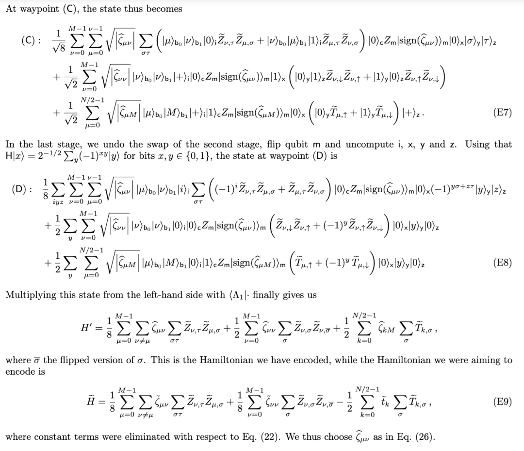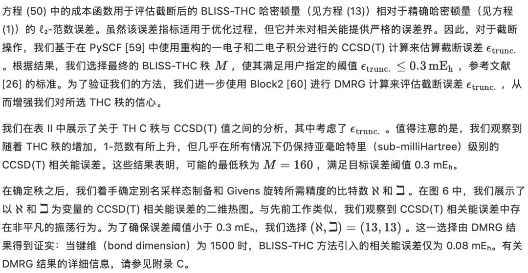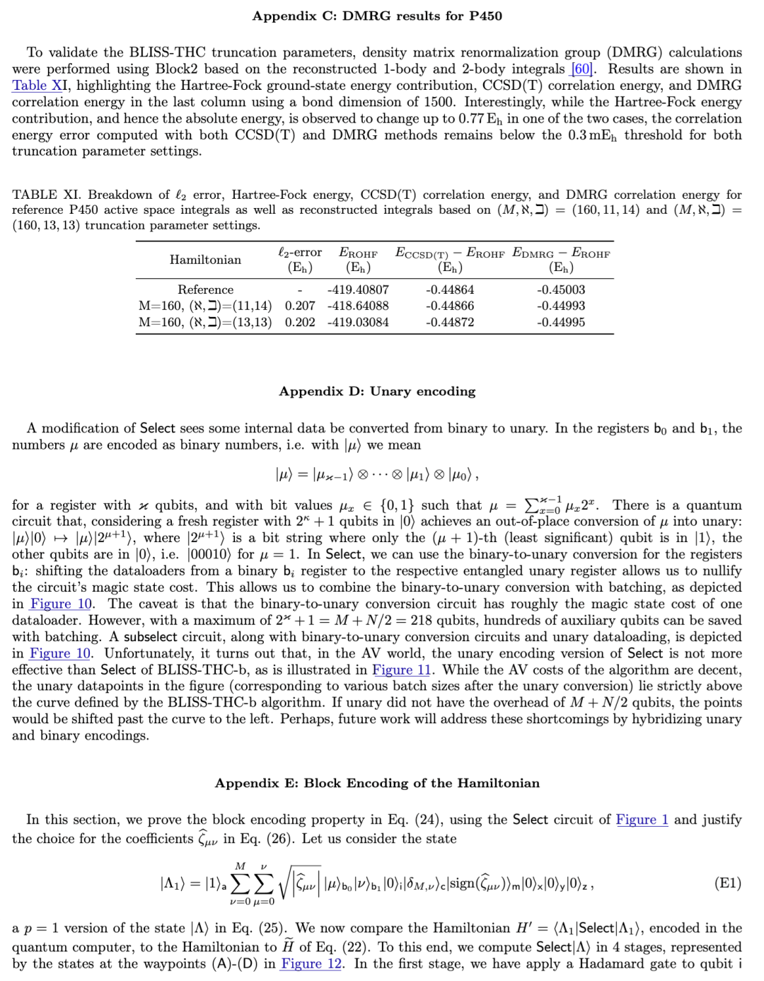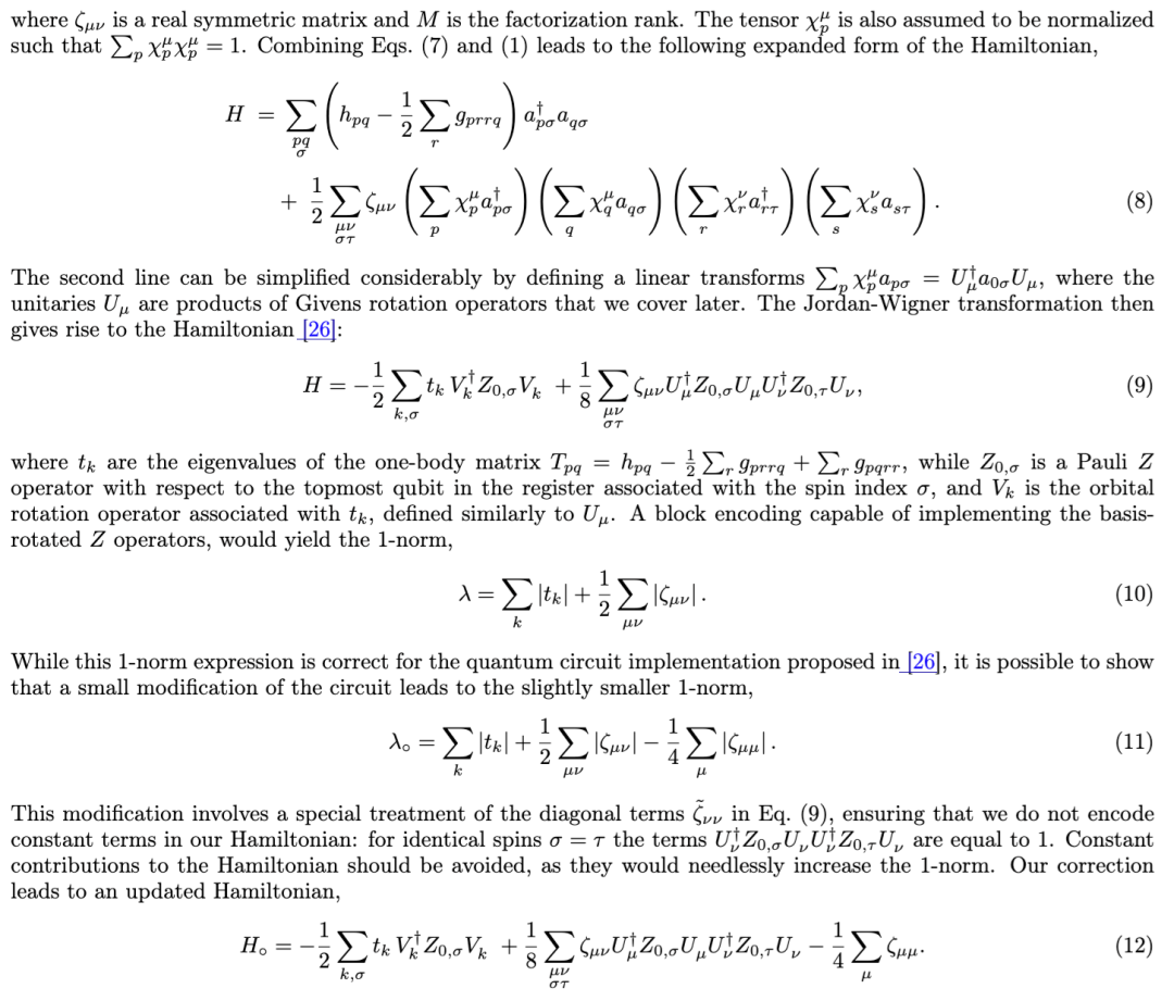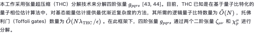 从算法角度看,早期使用量子相位估计算法(QPE)的研究主要集中在通过在量子计算机上对时间演化算符 U=exp(−iHt)进行 Trotter 分解,来估算电子结构哈密顿量 H的谱。然而,近期的研究趋势已转向采用“量子比特化”(qubitization)方法:这是一种利用量子行走算符将哈密顿量 H的能量 E编码为其本征值 ±arccos(E/λ) 的QPE变体,其中 λ是一个被称为“1-范数”(1-norm)的参数。需注意,此处的1-范数并非指哈密顿量的诱导ℓ¹范数,而是指其算子范数的一个上界。从技术层面看,该1-范数值出现在“块编码”(block encoding)过程中,即量子行走算符中将哈密顿量作用于代表系统的量子比特的部分 [21–23]。目前,qubitization 被认为是电子结构计算的前沿技术,其计算成本与 λ成正比。为了显著缩短量子计算的运行时间,可以采用能够编码具有更低1-范数的因式分解哈密顿量的算法。当前性能最优(资源消耗最低)的量子算法,要么基于“双重因式分解”(Double Factorization, DF)方法 [27],要么利用“张量超压缩”(Tensor Hypercontraction, THC)技术 [26]。这些方法在预期的量子计算运行时间方面表现出非常令人鼓舞的改进。据估计,对于FeMoco和P450体系,在特定运行表面码的超导架构下,采样电子结构哈密顿量谱所需时间约为10²小时(或约10⁹个非克利福德门)[18, 26]。在此类初步方案基础上,最近的一些工作通过将DF与哈密顿量的“块不变对称性偏移”(block-invariant symmetry-shifts, BLISS)相结合,进一步降低了1-范数 [28, 31–35]。