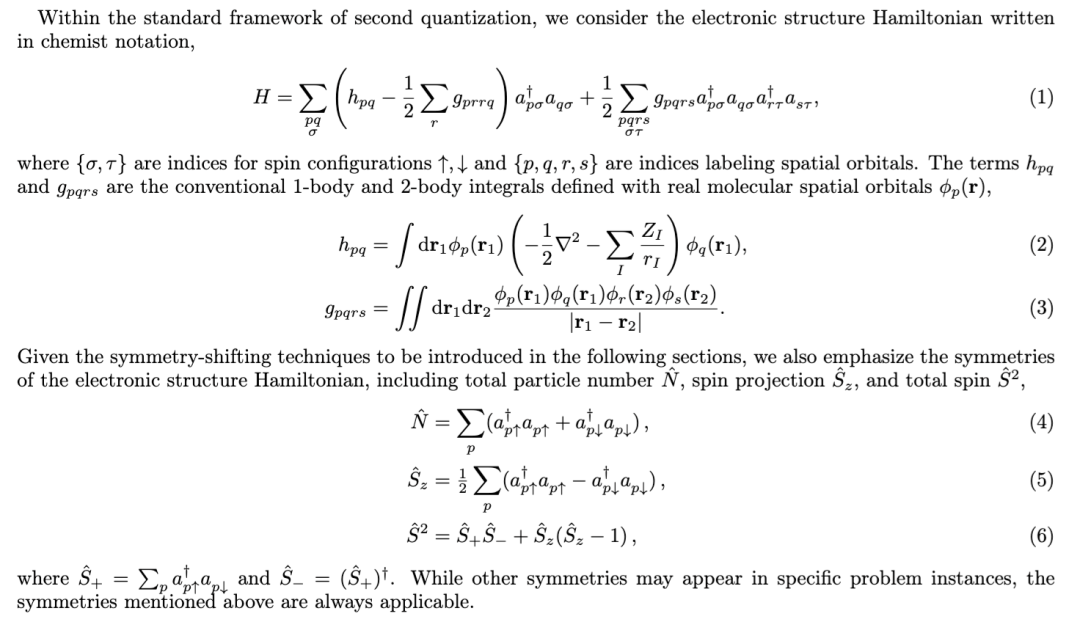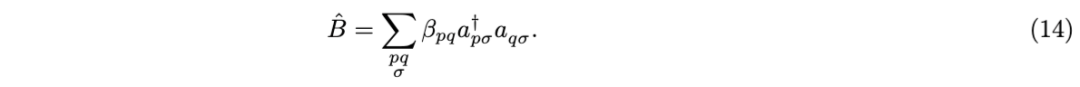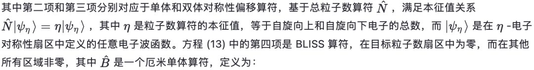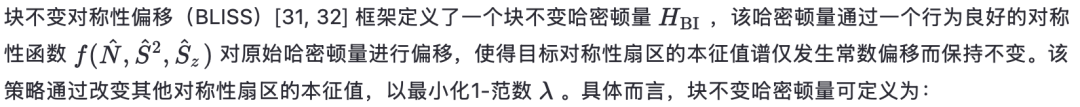 编码了一种基于对称性的规范不变性 [45],这有助于将 1-范数降低到比传统哈密顿量理论上可达到的水平更低的程度。BLISS 方法最终利用了这样一个事实:传统的哈密顿量 H本身包含了冗余信息,而这些信息仅在考虑包含所有可能对称性扇区的完整福克空间时才必要。在该量子电路的背景下,输入和输出波函数通常属于一个单一且明确定义的对称性扇区,这意味着编译后的哈密顿量只需在该特定扇区内与原始哈密顿量相等即可。我们通过显式写出块不变哈密顿量来结束本节,如下所示: