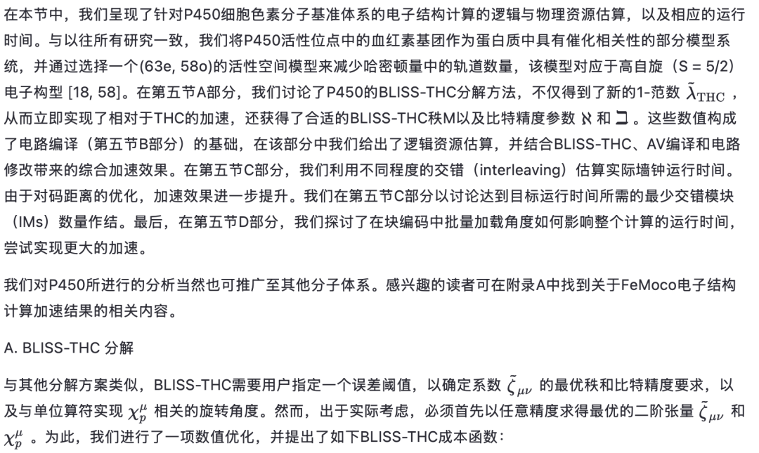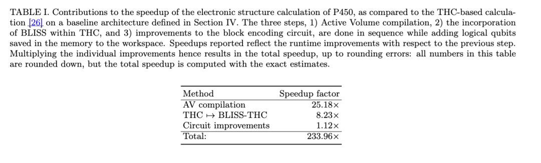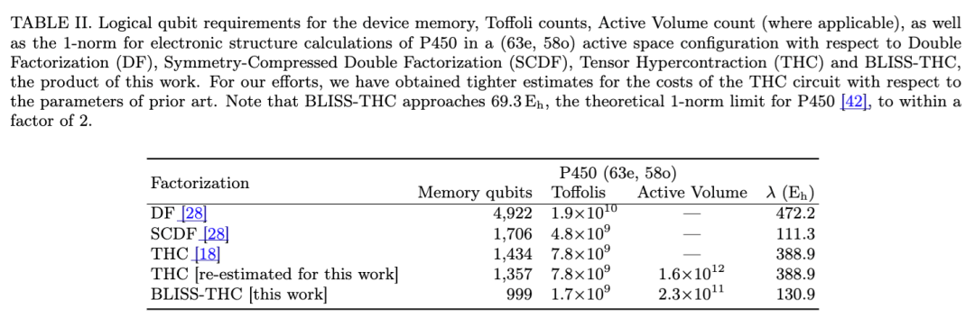 在本研究中,我们将BLISS技术与THC相结合。以P450体系为基准,我们证明:通过BLISS-THC方法、AV编译以及对块编码电路的一些改进,相较于在不具备AV功能的等效光子硬件上进行的THC计算,P450电子结构计算的计算运行时间至少减少了233倍。不同加速因素的具体分解见表I,而表II则简要回顾了此前针对P450电子结构计算的各项改进,直至本工作的进展。