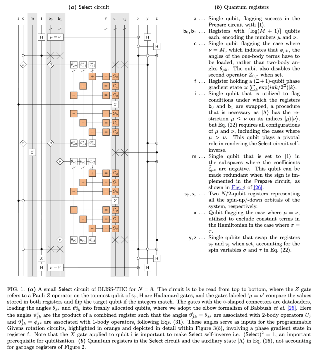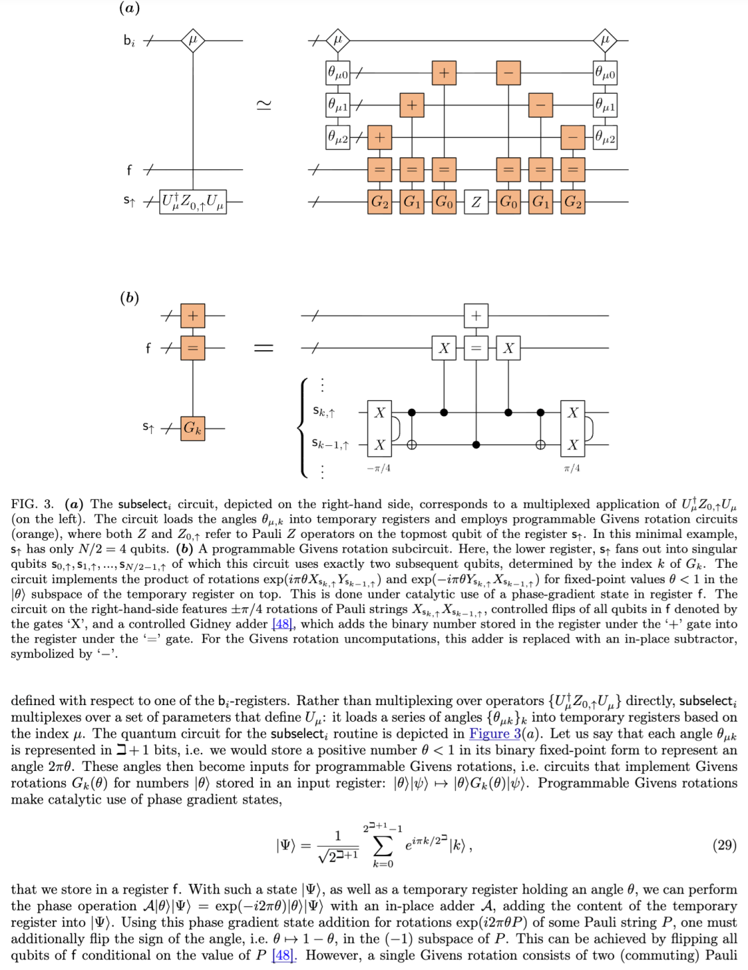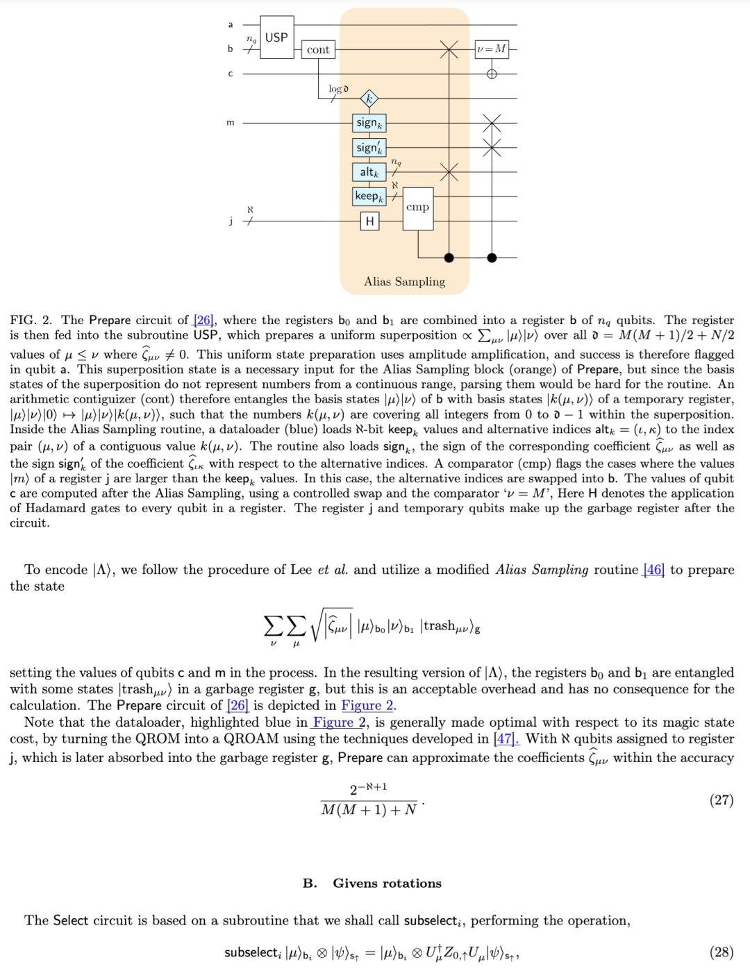 接下来,我们将对电路进行教学性的解释,突出我们在其构建上的修改,并将读者引导至相关文献以获取更多细节。块编码是一系列子程序的组合:Prepare†、Select 和 Prepare,其中 Select 子程序如图1所示,Prepare 子程序如图2所示,以及对后者的反计算(uncomputation)。我们首先从第 III A 节中的 Prepare 过程开始。在了解该过程及算法中涉及的量子比特寄存器之后,我们继续讨论 Select 过程,并首先聚焦于电路中实现单体和双体算符的部分(见第 III B 节):图1中用橙色高亮显示的是所谓的 Givens 旋转电路。在第 III C 节中,我们将考虑完整的 Select 电路,以及一些可以促进时间与空间复杂度之间权衡的变体。