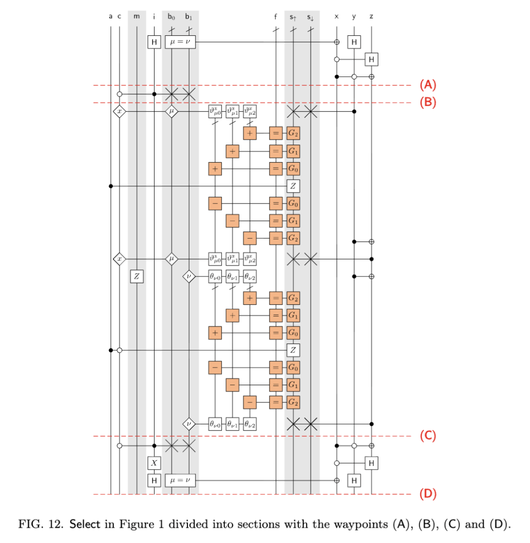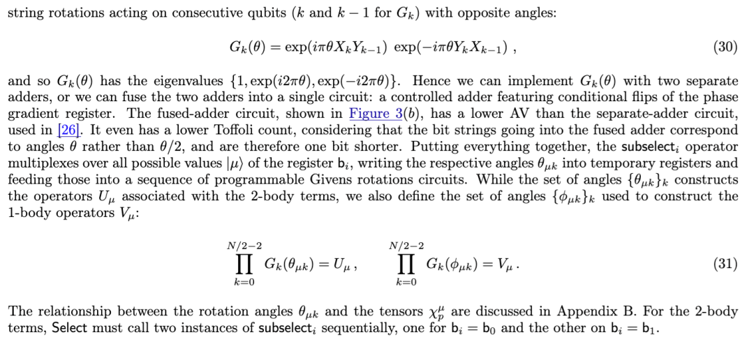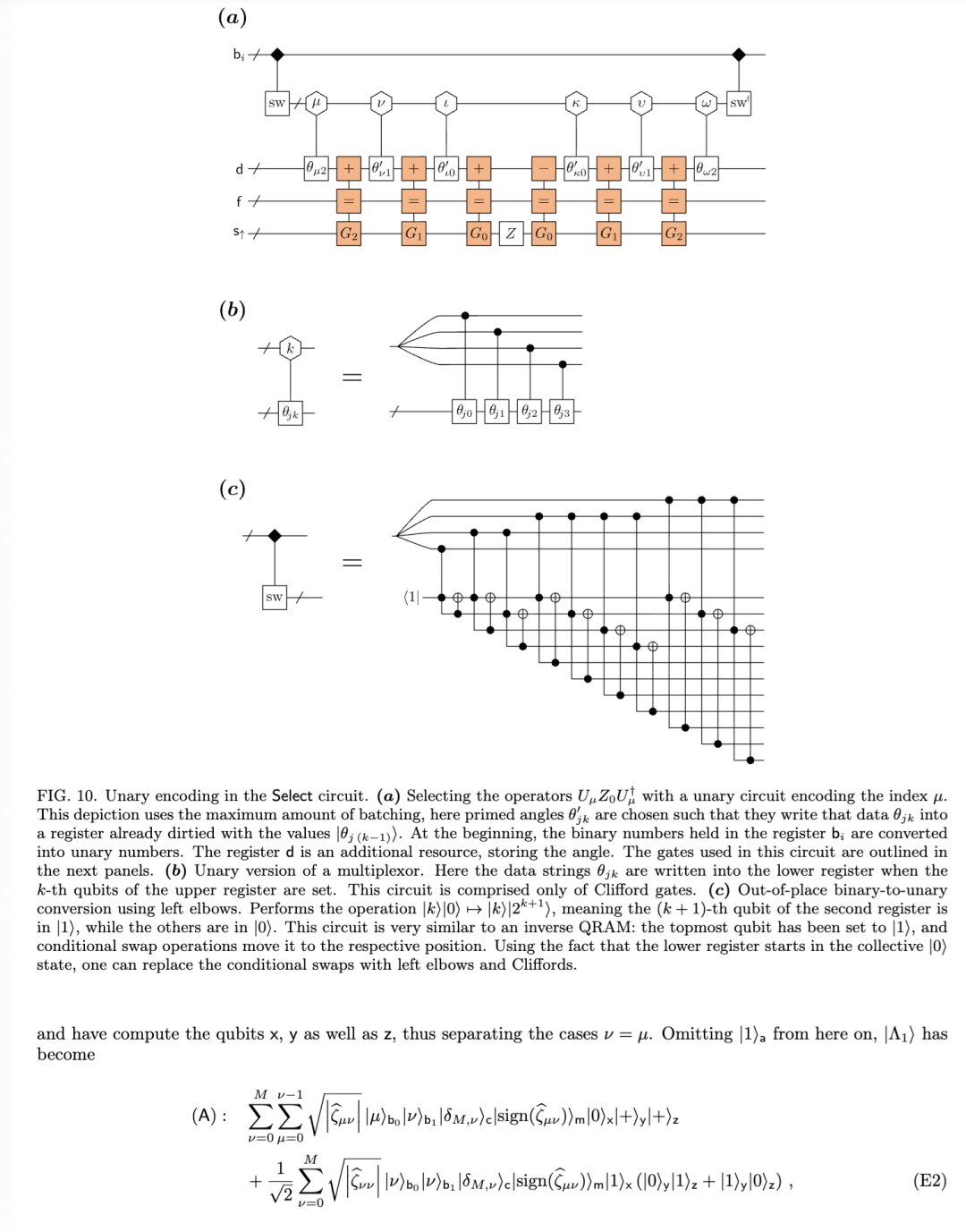 接下来,我们将对电路进行教学性的解释,突出我们在其构建上的修改,并将读者引导至相关文献以获取更多细节。块编码是一系列子程序的组合:Prepare†、Select 和 Prepare,其中 Select 子程序如图1所示,Prepare 子程序如图2所示,以及对后者的反计算(uncomputation)。我们首先从第 III A 节中的 Prepare 过程开始。在了解该过程及算法中涉及的量子比特寄存器之后,我们继续讨论 Select 过程,并首先聚焦于电路中实现单体和双体算符的部分(见第 III B 节):图1中用橙色高亮显示的是所谓的 Givens 旋转电路。在第 III C 节中,我们将考虑完整的 Select 电路,以及一些可以促进时间与空间复杂度之间权衡的变体。