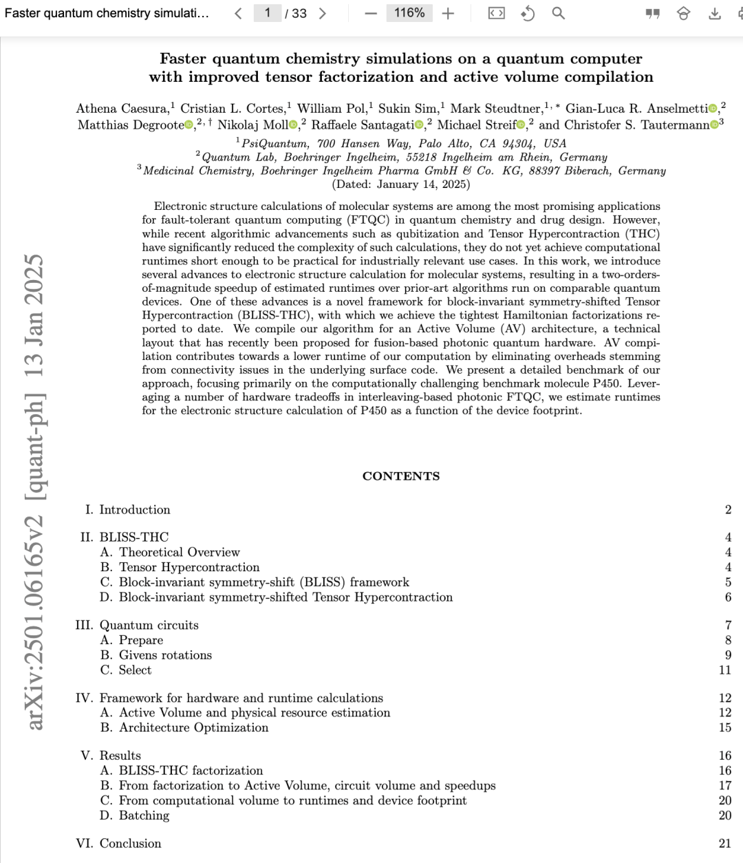 其中一项进展是一种全新的“块不变对称性偏移张量超压缩”(BLISS-THC)框架,借助该框架,我们实现了迄今为止最紧凑的哈密顿量因式分解。我们将算法编译到“活性体积”(Active Volume, AV)架构上,这是一种最近为基于光子融合的量子硬件所提出的新型技术架构。AV编译通过消除底层表面码中因连接性问题带来的开销,进一步降低了计算的运行时间。