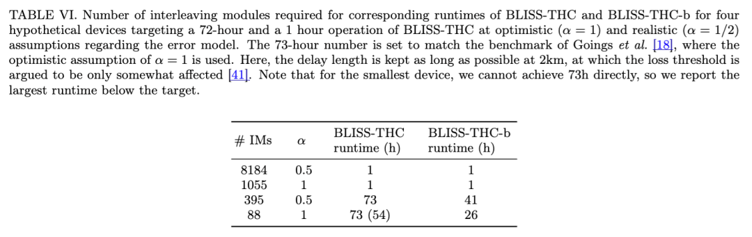 在以下示例中,我们希望计算在特定时间框架内运行我们的BLISS-THC算法所需的最小IM数量。假设我们将交错长度固定为2km——一个较大的值,在这个值下我们开始注意到光纤损耗[41]的影响。由于算法固定了内存量子比特的数量,最小IM数量由我们将需要在工作空间中使用多少量子比特决定。在表VI中,我们提供了运行时间为73小时的结果,这是Goings等人[18]报告的算法运行时间,该算法使用