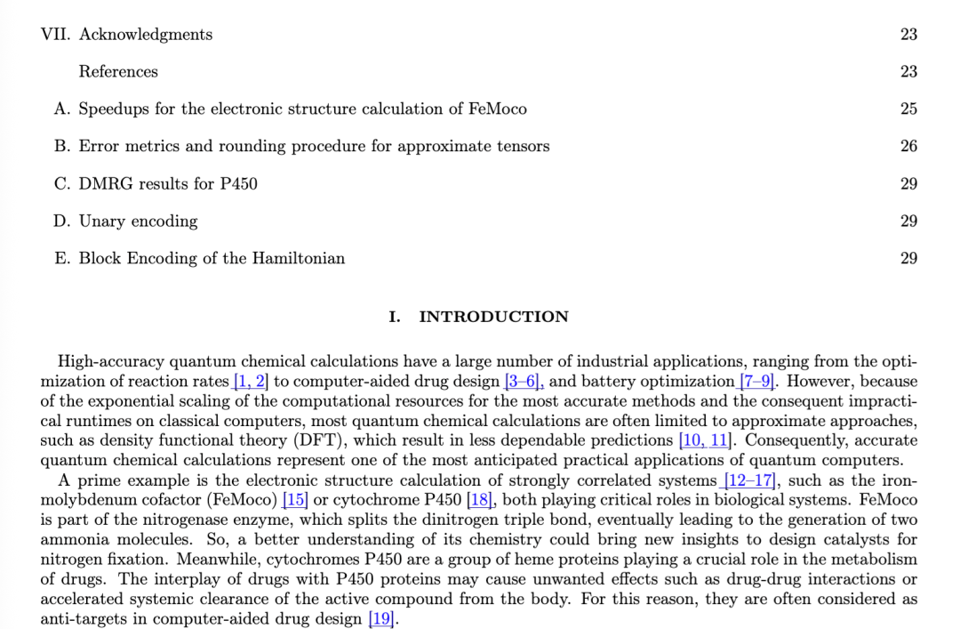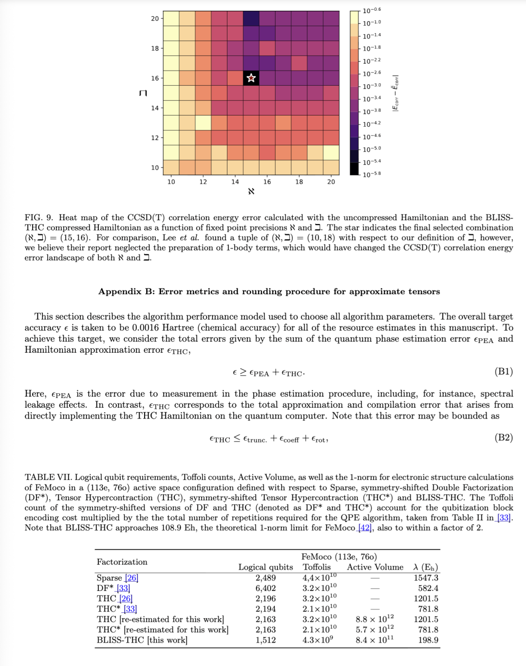 然而,即使使用当前最高效的算法 [26],对于诸如细胞色素P450 [18] 这类具有工业重要性的体系,此类计算的实际运行时间仍处于“天”量级。Santagati 等人 [5] 指出,这与制药工业工作流程所需的速度不相容,后者要求计算必须在秒级甚至更快的时间内完成。这一要求源于这样一个事实:在大多数情况下,人们关注的是系综性质的计算。通常,模拟需要进行大量(约O(10⁶)次)[36, 37] 单点能量计算,以获得热力学系综的性质 [38]。目前,严重的近似方法使得量子化学能够处理具有一定规模的相关体系,但对于强关联体系(例如药物与P450蛋白血红素中心相互作用的情况),这些近似不再适用。而精确描述这些体系的计算任务,对于经典硬件而言又超出了当前能力范围。因此,为了让量子计算机真正适用于工业应用,还需要进一步降低计算成本。这很可能需要将算法改进、哈密顿量分解优化与更先进的硬件和更高效的架构相结合。