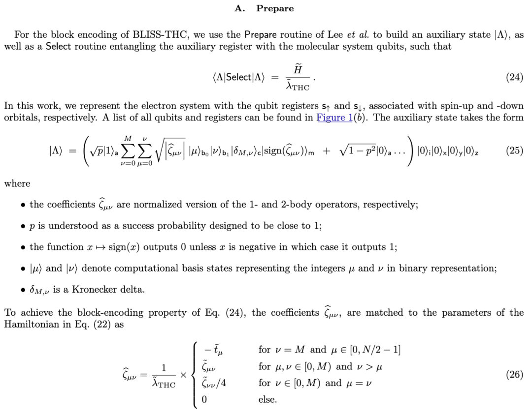 在本节中,我们考虑 BLISS-THC 的哈密顿量块编码,这是一个作为量子系统某子空间中因子化哈密顿量的酉量子电路。由于 BLISS-THC 和 THC 生成形式相同的哈密顿量,我们提出一个与文献 [26] 中电路非常相似的量子电路,但进行了一些修改,这些修改被证明对其复杂性有益。由于电子结构计算几乎完全由对行走算符(walk operator)的调用构成,因此即使是对块编码的微小修改也可能影响整体运行时间。