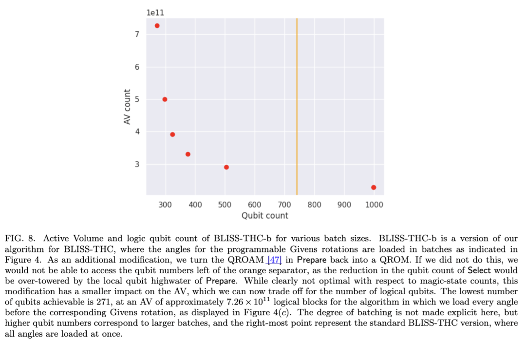 基于这一思路,我们通过调整工作区量子比特的数量,推导出了在固定计算时长下的最小设备尺寸。通过修改算法,还可以实现更大的空间节省:原始的THC流程所需的辅助量子比特数量远远超过表示系统本身所需的量子比特数。虽然BLISS-THC已为P450体系直接减少了299个量子比特,但我们发现,通过进一步优化,可将量子比特峰值使用量降至仅271个,而活性体积(AV)仅增加3.2倍。尽管我们已展示如何利用这种权衡来缩短运行时间,但在设备规模受限的情况下,接受一定的AV代价以换取更小的量子计算机,也是一种合理的选择。