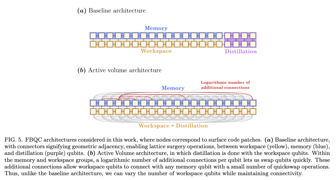 最近,一种名为“活性体积”(Active Volume, AV)的新架构被提出,用于基于光子融合的容错量子计算(FTQC),该架构通过利用量子计算机中物理组件之间的非局域连接,有望显著减少计算运行时间 [39]。在不具备活性体积能力的传统架构中,执行容错操作需要大量逻辑量子比特的参与,而这些量子比特在其他时间可能处于空闲状态,导致编译器无法并行地将这些量子比特用于其他任务。尽管AV编译的性能已在RSA分解 [39] 和椭圆曲线密码学 [40] 中得到分析,但目前尚无针对化学问题的研究。
