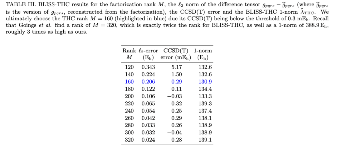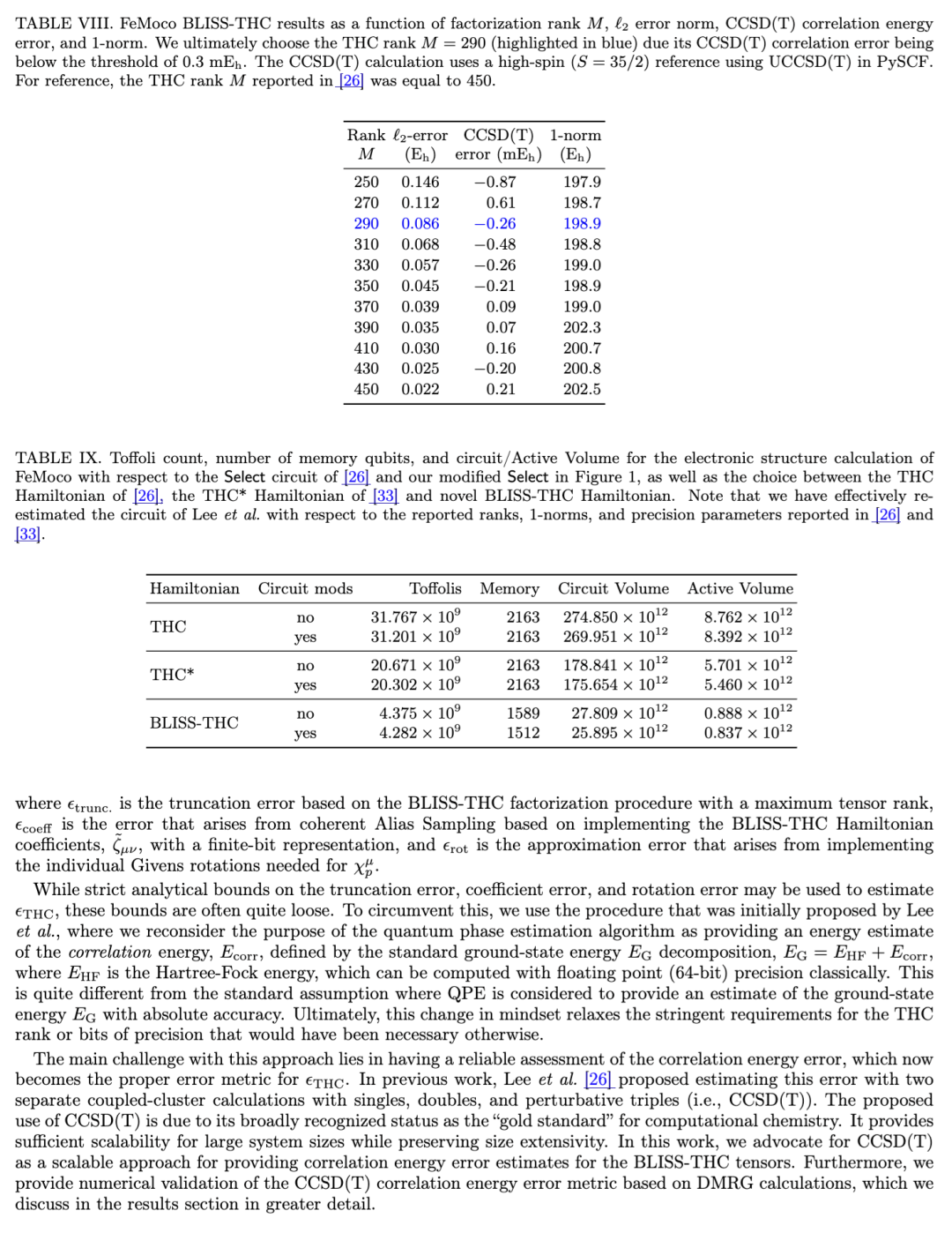 本文绝非量子计算机上电子结构计算运行时间优化的终点。未来仍有许多极具前景的方向可以实现进一步的加速。尽管我们通过引入BLISS显著提升了THC的性能,将P450体系的1-范数从389 Eₕ降低至130.9 Eₕ,但我们尚未达到理论上的1-范数极限69.3 Eₕ [42]。其他哈密顿量因式分解技术 [31, 32] 可能会让我们更接近这一极限。