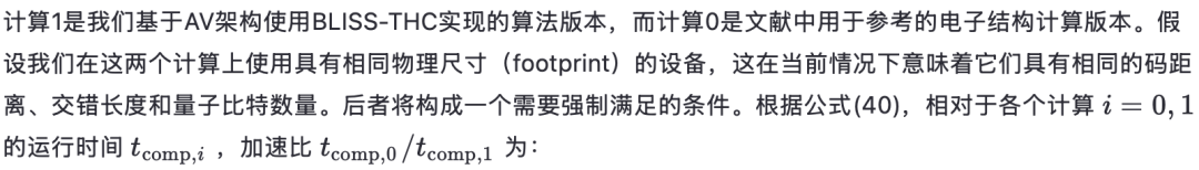 仅凭两个量子计算的逻辑资源估算,我们就可以推导出它们之间的相对加速比,而无需显式计算各自的运行时间。对于总运行时间的加速比,考虑电路修改、BLISS-THC 和 AV 编译的影响,以下两个量子程序是相关的: