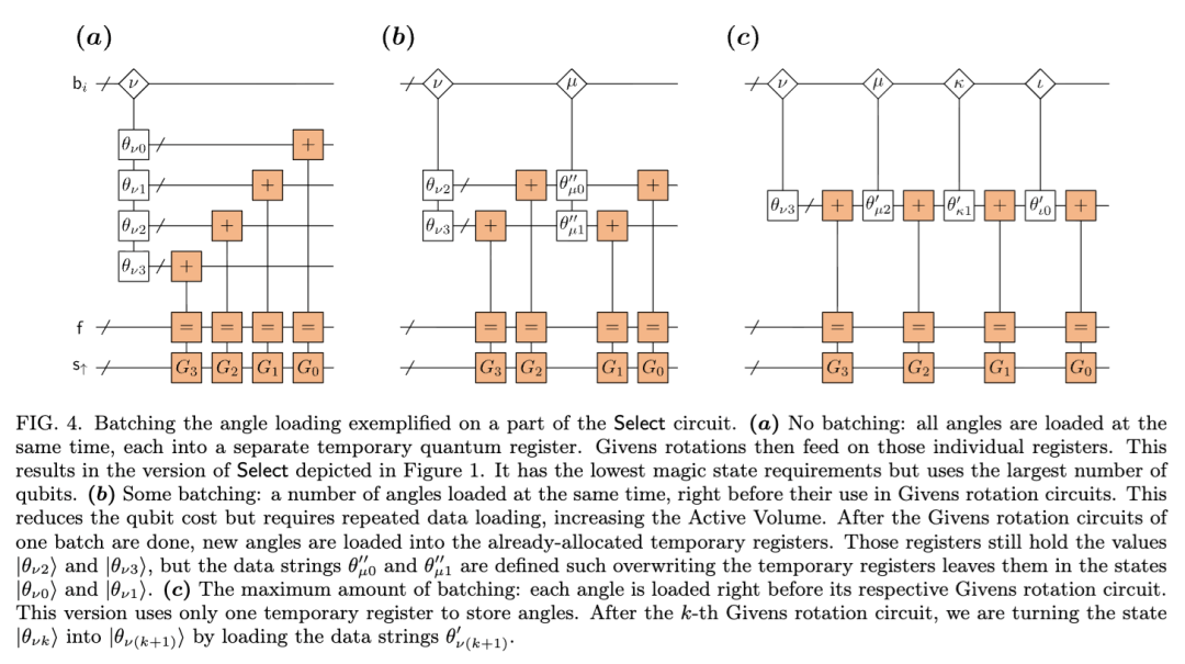 为最终加速计算,我们利用算法中量子比特峰值使用量(qubit highwater)与活性体积(AV)计数之间的权衡。此前,我们决定仅考虑一次性加载所有Givens旋转角度的Select电路版本——这些电路在托佛利门数量和AV计数方面是最优的,但具有较高的存储量子比特峰值使用量。事实上,对于P450体系,Select的局部峰值使用量主导了整个算法的量子比特需求。允许如图4所示的分批加载角度的电路,我们可以降低整个算法的量子比特需求,代价是增加活性体积(AV)。一旦存储中的量子比特被释放,它们就可以重新分配给工作区,从而在假设AV增长能够被克服的前提下,实现可能的运行时间加速。