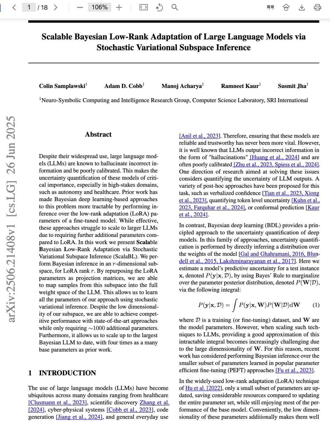 摘要 尽管大语言模型(LLMs)被广泛使用,但它们常会生成错误信息(即“幻觉”),且置信度校准性能较差。这使得对这些模型进行不确定性量化变得至关重要,尤其是在自动驾驶、医疗等高风险领域。先前的研究通过在微调模型的低秩适应(LoRA)参数上进行贝叶斯深度学习推理,使该问题更具可行性。尽管这些方法有效,但由于相比标准LoRA还需引入更多额外参数,因此在扩展到更大的LLM时面临困难。在本研究中,我们提出了基于随机变分子空间推理的可扩展贝叶斯低秩适应方法(ScalaBL)。我们在一个r维子空间中进行贝叶斯推理(r为LoRA的秩)。通过将LoRA参数重新用作投影矩阵,我们能够将该子空间中的样本映射到LLM的完整权重空间中。这使得我们可以使用随机变分推理来学习本方法的所有参数。尽管子空间维度较低,我们的方法仍能与当前最先进的方法达到相当的性能,且仅需约1000个额外参数。此外,该方法使我们能够扩展到迄今为止最大的贝叶斯LLM,其基础模型参数数量是此前工作的四倍。