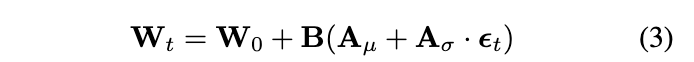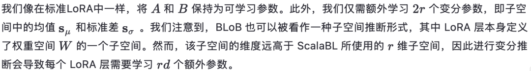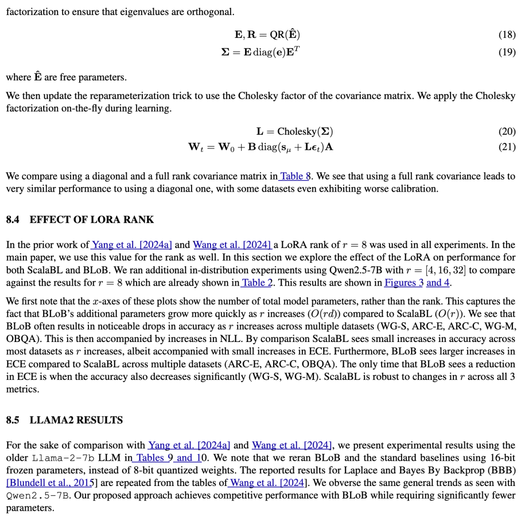其中,εt∼N(0,1)。Wang 等人 [2024] 通过实验表明,他们的方法在性能上优于拉普拉斯LoRA。然而,拉普拉斯近似的一个显著优势是无需学习任何额外参数。而由于引入了方差参数 Aσ,BLoB 所需学习的参数数量比基础的LoRA微调过程多了约40%。即使对于较小的70亿参数模型,这也意味着要额外增加数百万个参数。