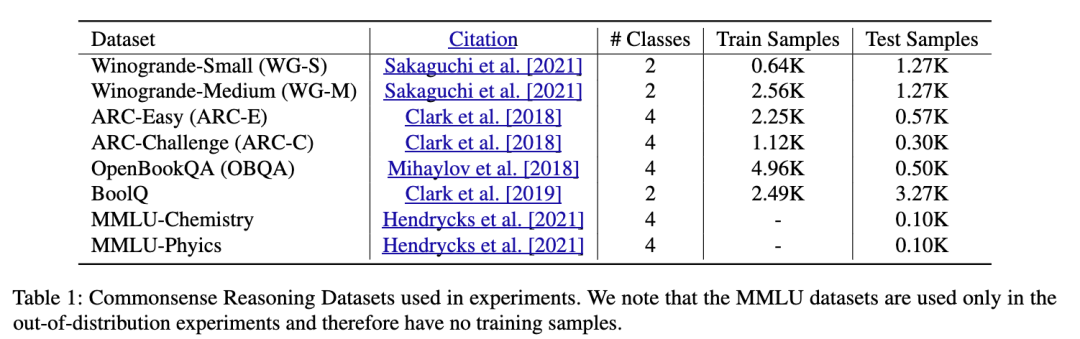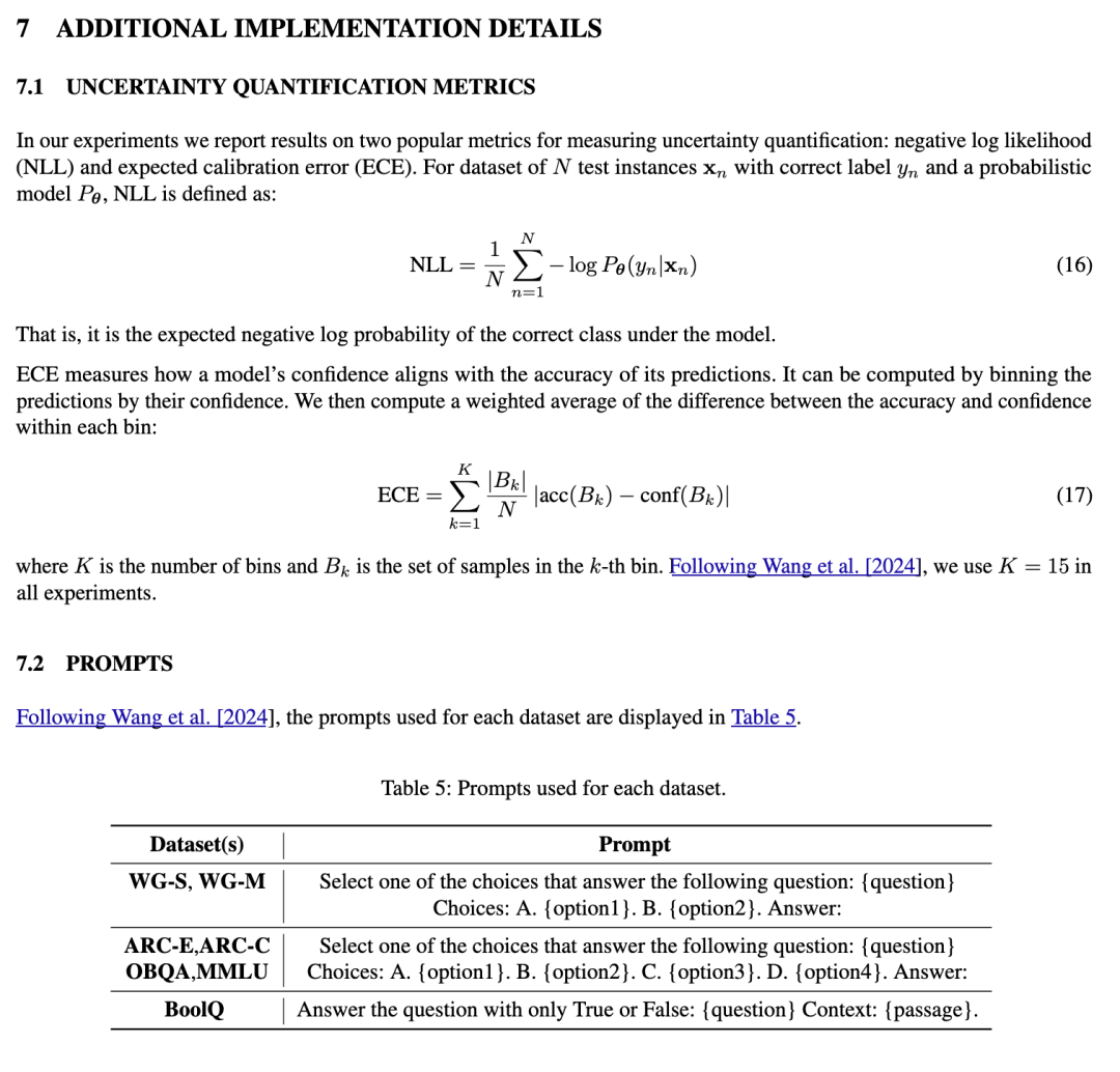 我们遵循 Yang 等人 [2024a] 和 Wang 等人 [2024] 的实验协议,使用一组常识推理数据集(见表1)对我们的方法进行微调和评估。这些数据集以多项选择题的形式呈现。给定一个包含问题的输入提示,我们获取大语言模型(LLM)在下一个词元上的 softmax 分布,然后提取每个可能答案(例如 A、B、C、D)对应的 logits,并重新归一化。通过这种方式,我们将这些常识推理任务转化为分类任务,从而便于计算标准的不确定性指标。具体而言,我们报告分类准确率(ACC)、期望校准误差(ECE)[Guo 等, 2017] 以及正确类别的负对数似然(NLL)。有关这些指标的更多细节见附录第7.1节。