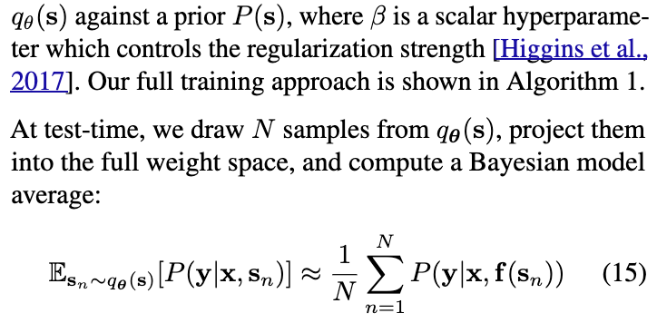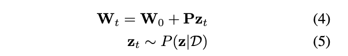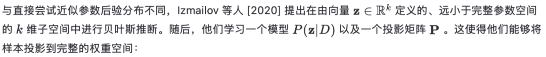 正如 Izmailov 等人 [2020] 所强调的,该模型并不是原始参数后验分布的一种重新参数化,因为向完整参数空间的投影是不可逆的。然而,这种方法的优势在于,能够在子空间中执行贝叶斯推理,从而使得许多原本难以实现的常见贝叶斯推理技术变得可行。据我们所知,此类子空间推理技术此前从未被应用于大语言模型(LLMs)。