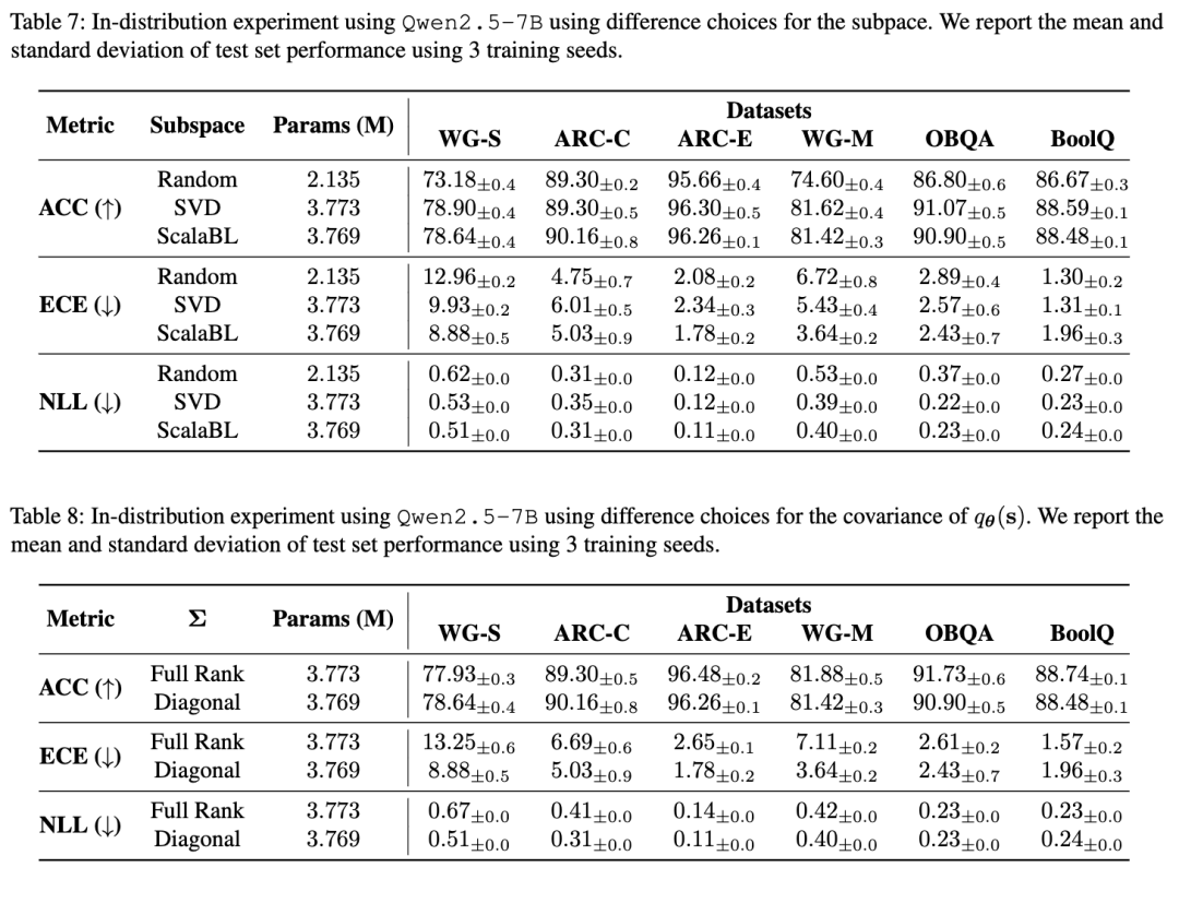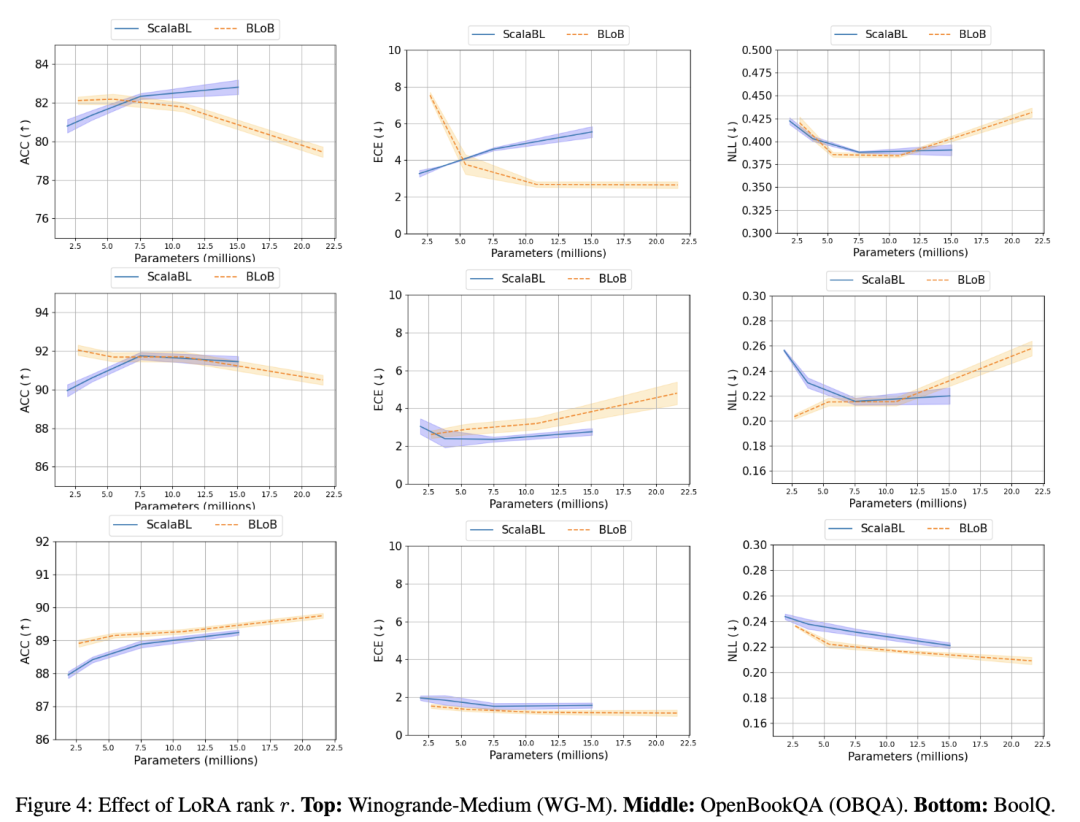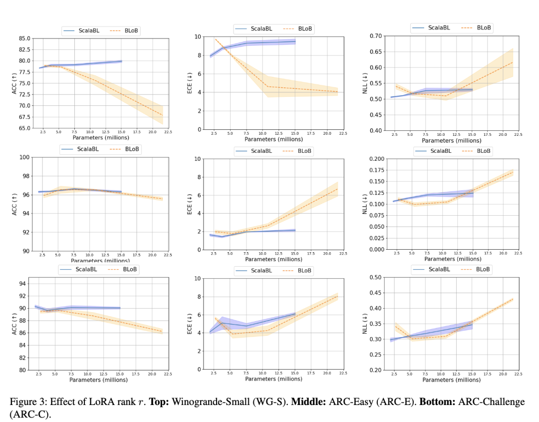 不出所料,BLoB 在所有方法中通常表现最好,且经常以微弱优势优于 ScalaBL。然而,由于其参数数量更多,BLoB 的表示能力严格强于 ScalaBL 或拉普拉斯方法。与 MLE 相比,BLoB 需要额外约 1.4 倍的参数,而 ScalaBL 仅需约 1.0001 倍。对于本实验所用的大模型和秩设置,BLoB 比 MLE 多出约 160 万个参数,而 ScalaBL 仅增加 912 个参数。在此背景下,ScalaBL 以远低于 BLoB 的成本实现了极具竞争力的性能。例如,在 ARC-Challenge 数据集上,BLoB 的 ECE 性能比 ScalaBL 提高约 1.3 倍,准确率相近,但 BLoB 所需的额外参数数量是 ScalaBL 的 1792 倍。