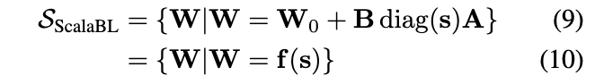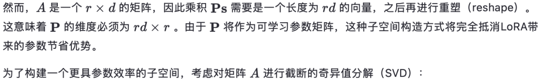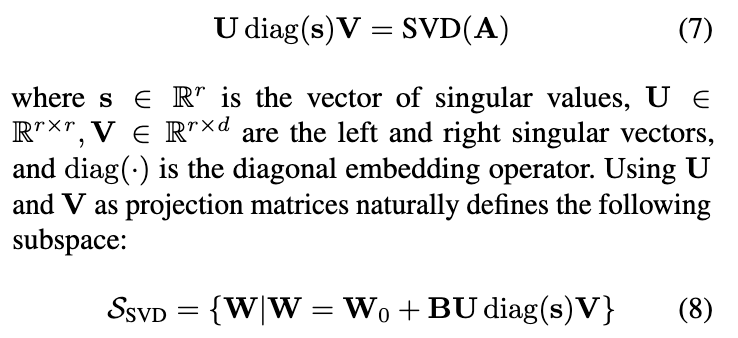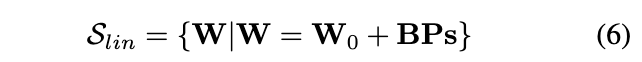 我们注意到,BU是两个线性参数矩阵的乘积,其表示能力与单独使用 B相同。此外,由于 V的维度与 A相同,我们直接将 V重命名为 A。由此得到如下子空间:
