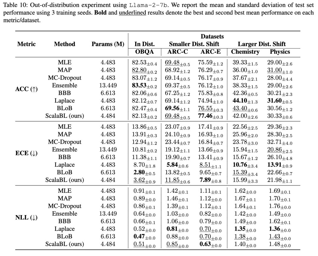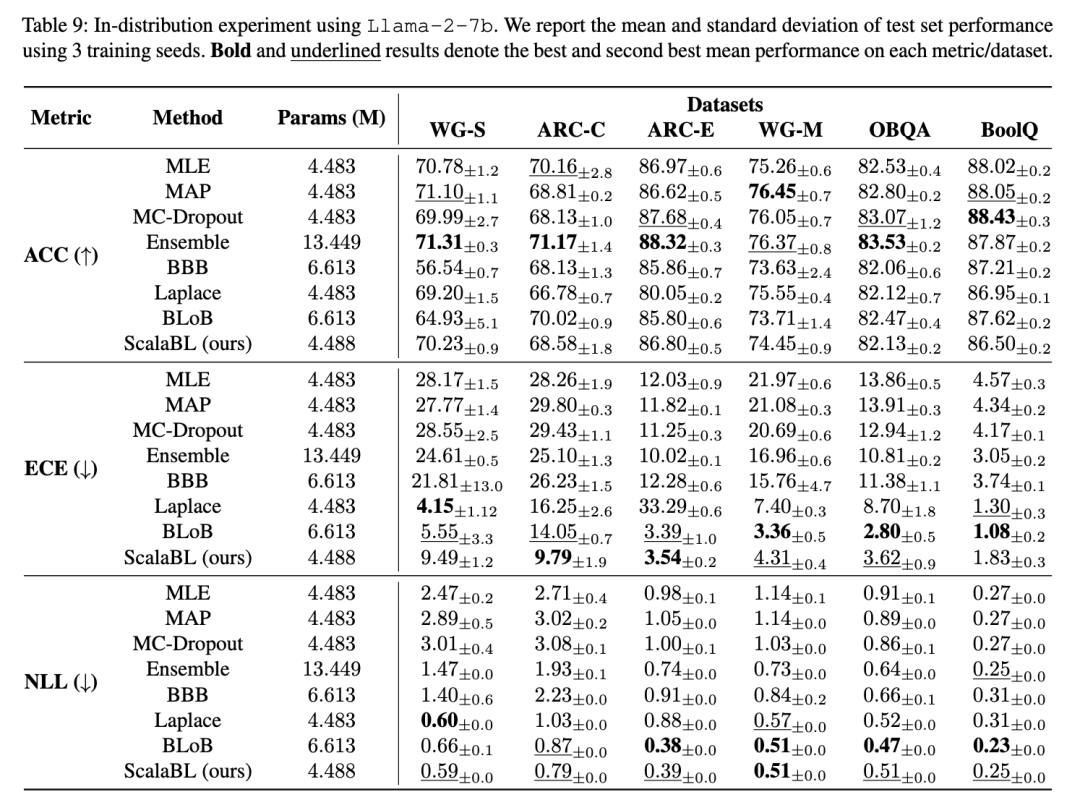 验证了 Yang 等人 [2024a] 和 Wang 等人 [2024] 的结论,我们发现最近的最先进方法在 ECE 和 NLL 指标上明显优于基线方法,且分类准确率几乎没有下降。此外,我们观察到 ScalaBL 的性能始终与 BLoB 相当,甚至在 Winogrande-Medium 数据集上以 ECE 指标达到了当前最优性能。